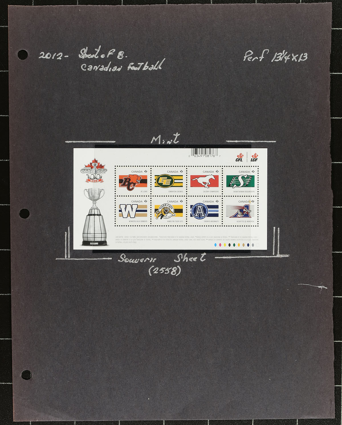 Valuable collection of mint never hinged "CFL Teams", June 2012, covering Unitrade #s 2558-2566, all in hingeless mounts in roughly 30 well described pages. The collection contains primarily coil singles, pairs, and strips (typically up to 30 and more stamps per issue), along with a few souvenir sheets. Face value alone totals an impressive $507.00 (including 409x "P" stamps). A lovely lot with multiple purposes. 2024 Unitrade =