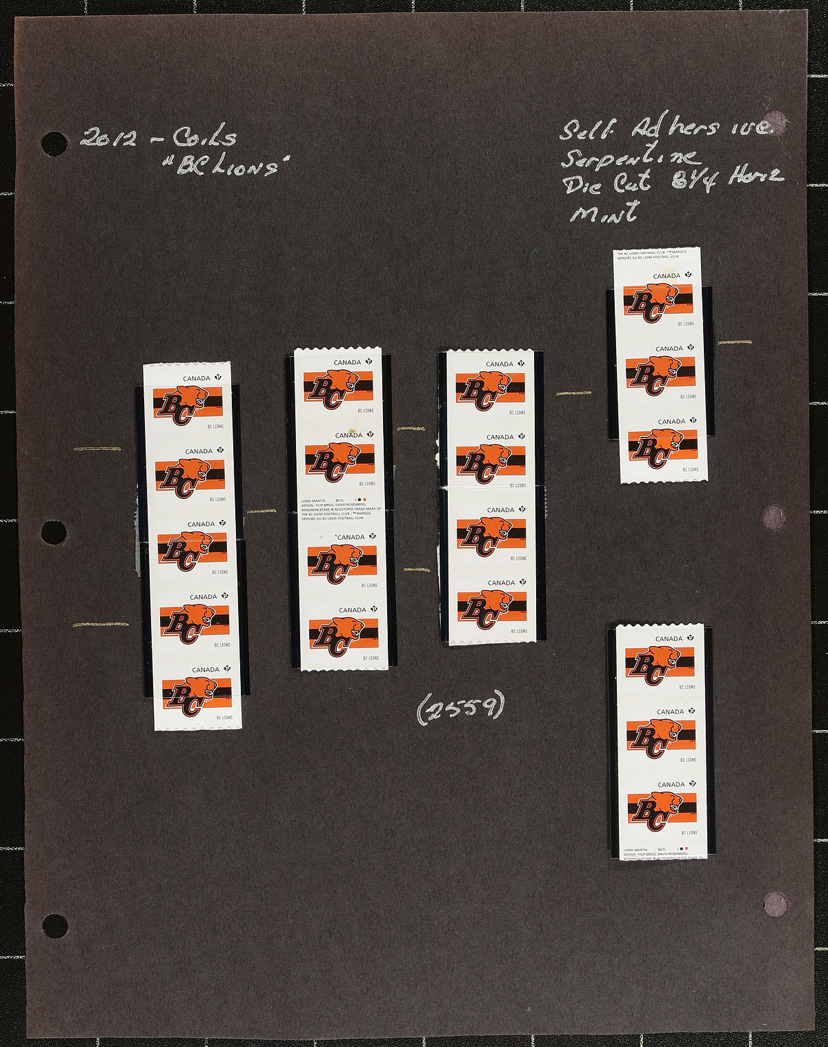 Valuable collection of mint never hinged "CFL Teams", June 2012, covering Unitrade #s 2558-2566, all in hingeless mounts in roughly 30 well described pages. The collection contains primarily coil singles, pairs, and strips (typically up to 30 and more stamps per issue), along with a few souvenir sheets. Face value alone totals an impressive $507.00 (including 409x "P" stamps). A lovely lot with multiple purposes. 2024 Unitrade =
