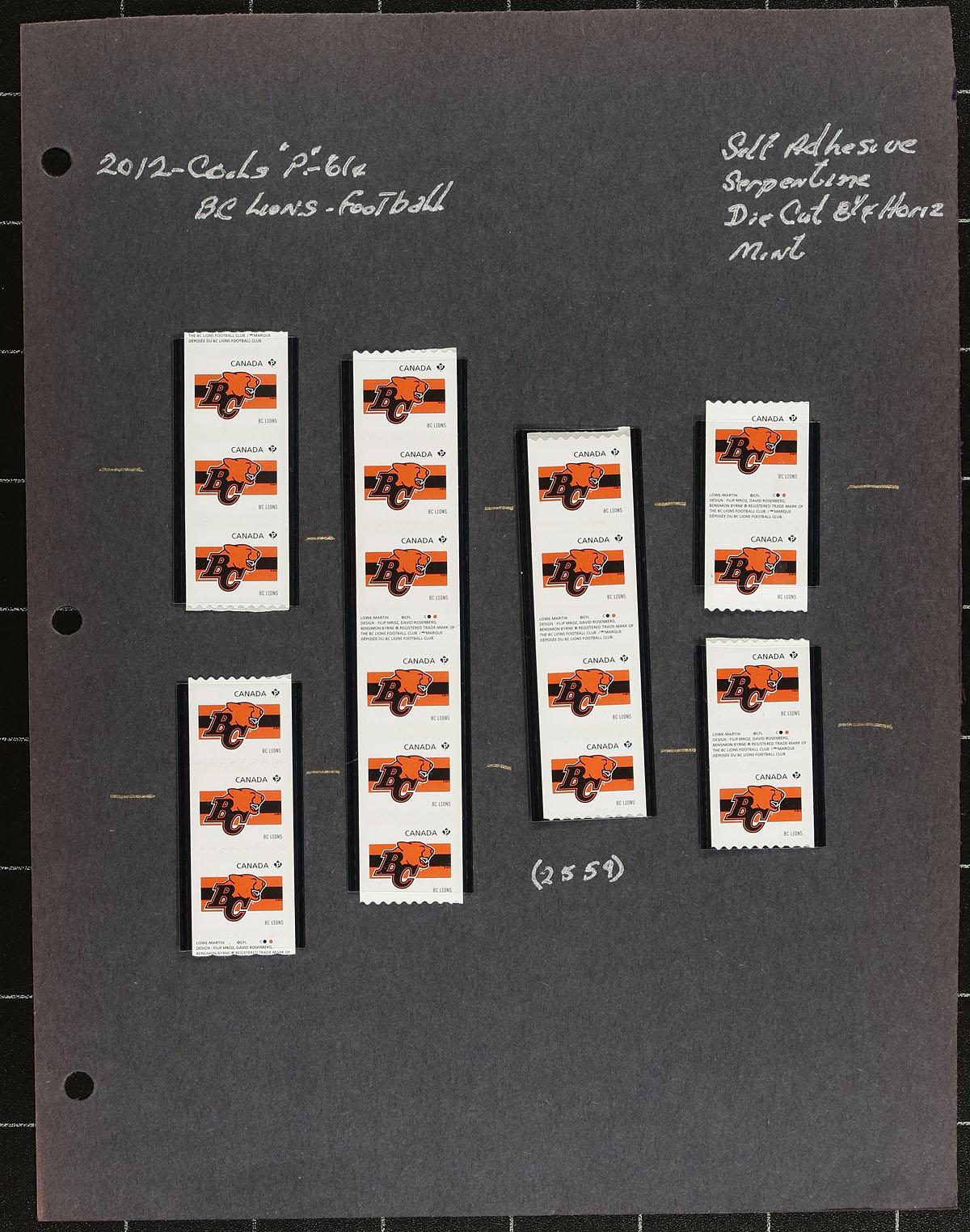Valuable collection of mint never hinged "CFL Teams", June 2012, covering Unitrade #s 2558-2566, all in hingeless mounts in roughly 30 well described pages. The collection contains primarily coil singles, pairs, and strips (typically up to 30 and more stamps per issue), along with a few souvenir sheets. Face value alone totals an impressive $507.00 (including 409x "P" stamps). A lovely lot with multiple purposes. 2024 Unitrade =