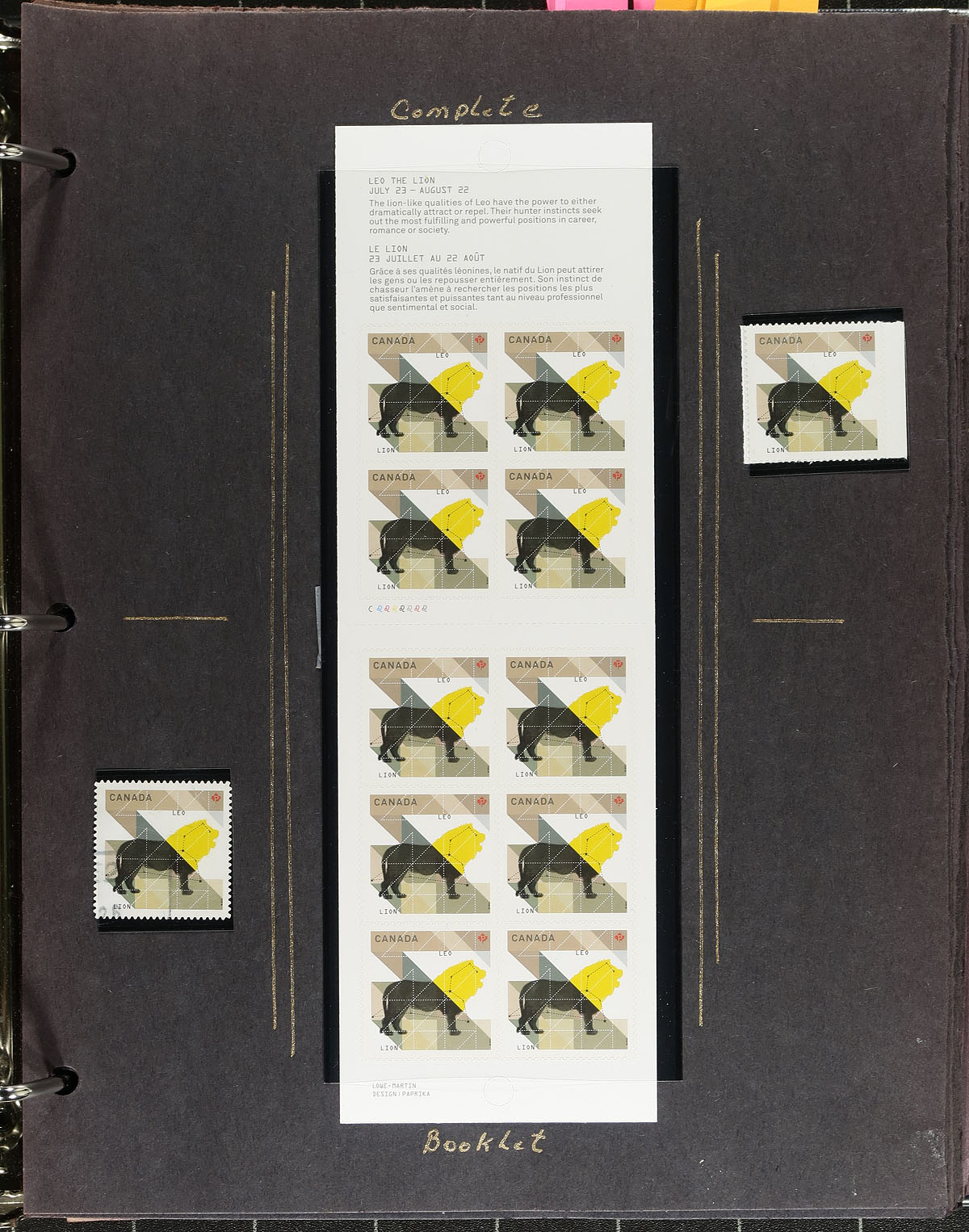 In-depth collection of primarily mint never hinged "Signs of the Zodiac" booklet issues, June 2011, covering Unitrade #s 2445, 2449-2452, all in hingeless mounts in roughly 50 well pages housed in a binder. The collection contains mint and used singles, and complete booklets, along with a mint souvenir sheetst, and roughly 30 first day covers (mix of Official and Lower Mainland B.C. postmarks). Face value alone totals $279.00 (including 226x "P" stamps). A nice group of these very popular issues. 2024 Unitrade =