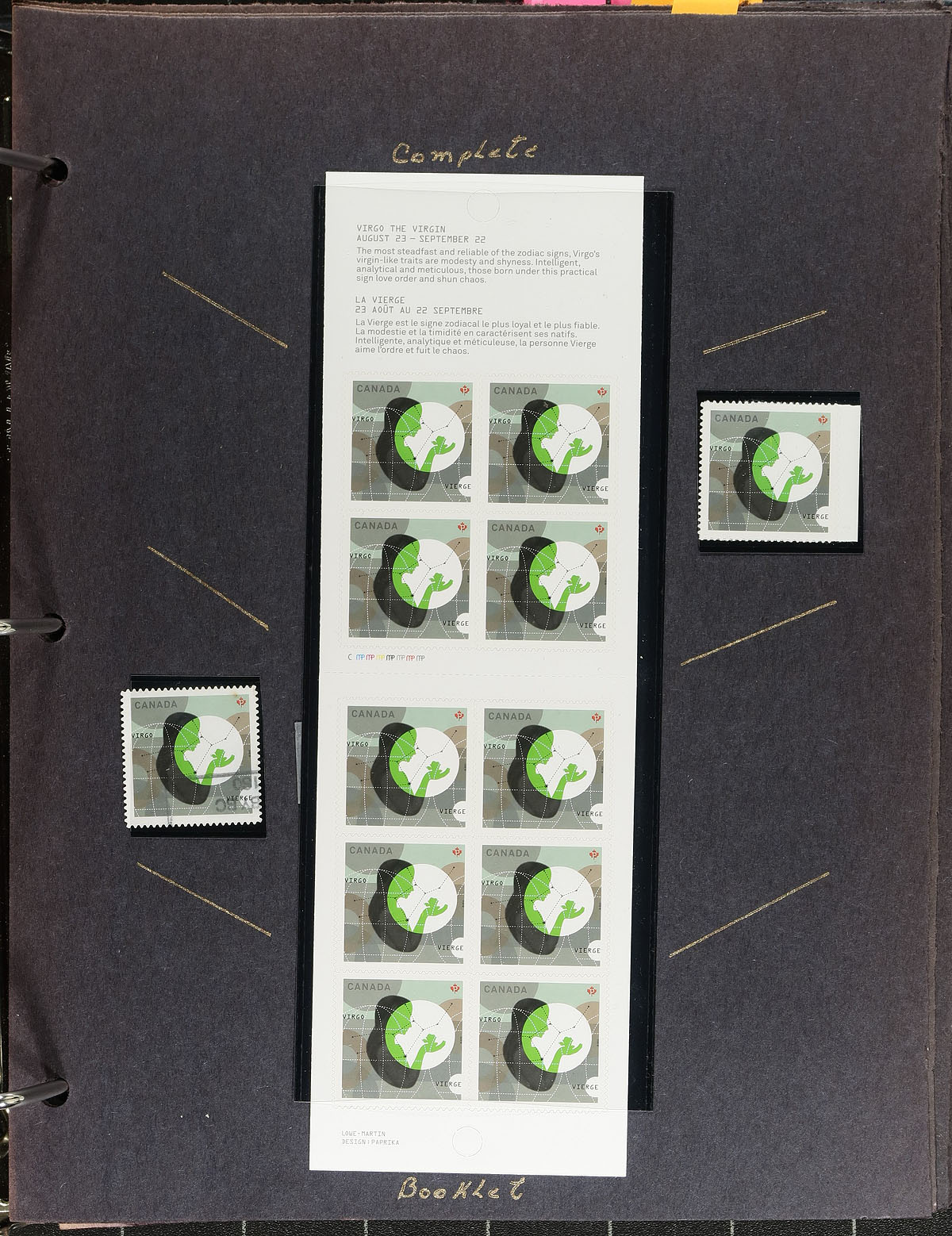 In-depth collection of primarily mint never hinged "Signs of the Zodiac" booklet issues, June 2011, covering Unitrade #s 2445, 2449-2452, all in hingeless mounts in roughly 50 well pages housed in a binder. The collection contains mint and used singles, and complete booklets, along with a mint souvenir sheetst, and roughly 30 first day covers (mix of Official and Lower Mainland B.C. postmarks). Face value alone totals $279.00 (including 226x "P" stamps). A nice group of these very popular issues. 2024 Unitrade =