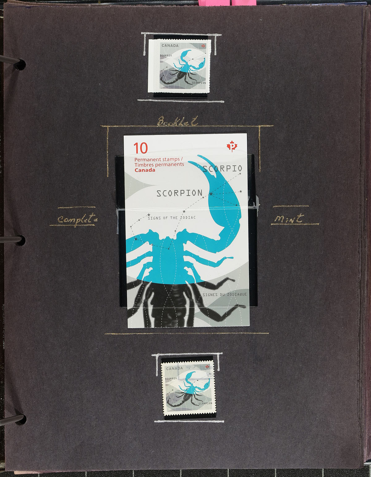 In-depth collection of primarily mint never hinged "Signs of the Zodiac" booklet issues, June 2011, covering Unitrade #s 2445, 2449-2452, all in hingeless mounts in roughly 50 well pages housed in a binder. The collection contains mint and used singles, and complete booklets, along with a mint souvenir sheetst, and roughly 30 first day covers (mix of Official and Lower Mainland B.C. postmarks). Face value alone totals $279.00 (including 226x "P" stamps). A nice group of these very popular issues. 2024 Unitrade =