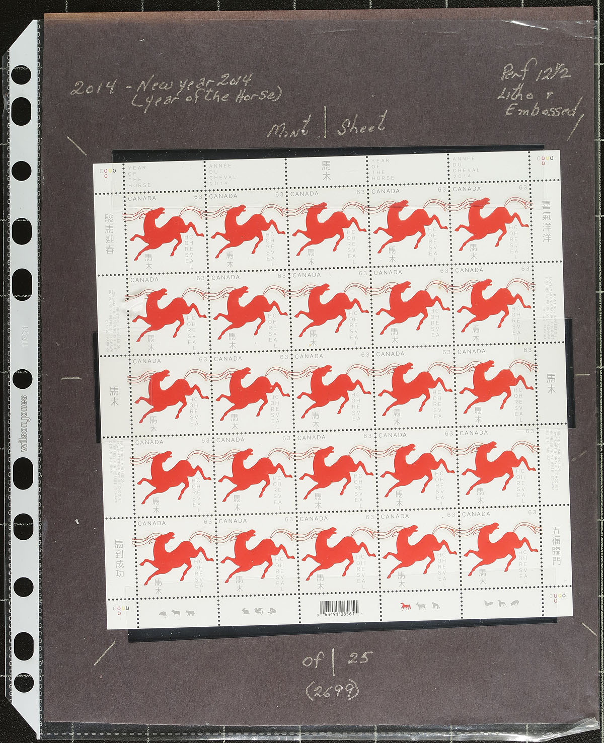 Attractive collection of primarily mint never hinged "Lunar New Year- Year of the Horse", January 2014, covering Unitrade #s 2699-2701, all in hingeless mounts in 18 well described pages. The collection contains mint and used singles, 2 mint sheets, matched set of mint and used plate blocks, mint and used souvenir sheets, booklets, and a few first day covers. Face value alone totals $95.00 alone! A lovely collection for any Canada collector. 2024 Unitrade =