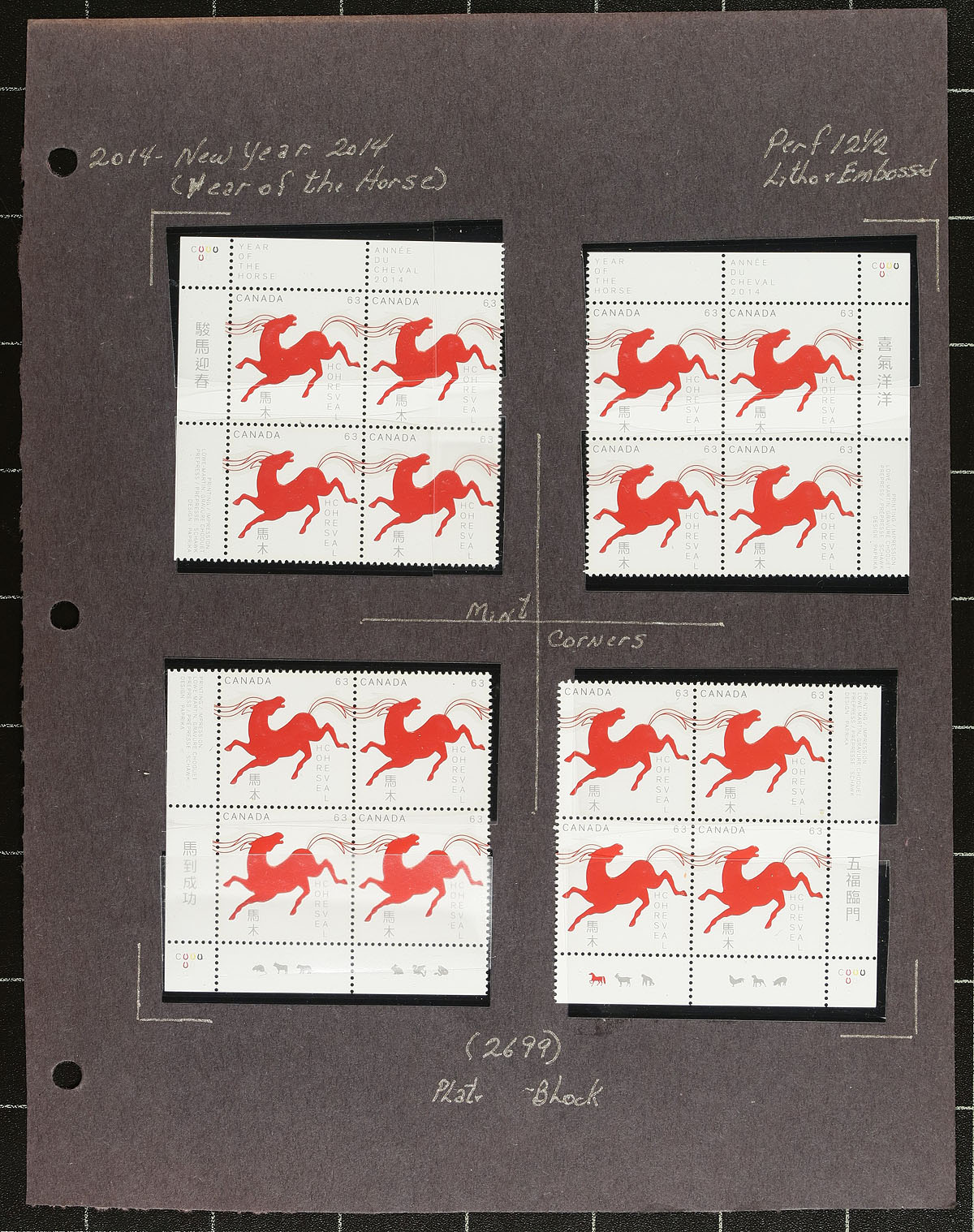Attractive collection of primarily mint never hinged "Lunar New Year- Year of the Horse", January 2014, covering Unitrade #s 2699-2701, all in hingeless mounts in 18 well described pages. The collection contains mint and used singles, 2 mint sheets, matched set of mint and used plate blocks, mint and used souvenir sheets, booklets, and a few first day covers. Face value alone totals $95.00 alone! A lovely collection for any Canada collector. 2024 Unitrade =
