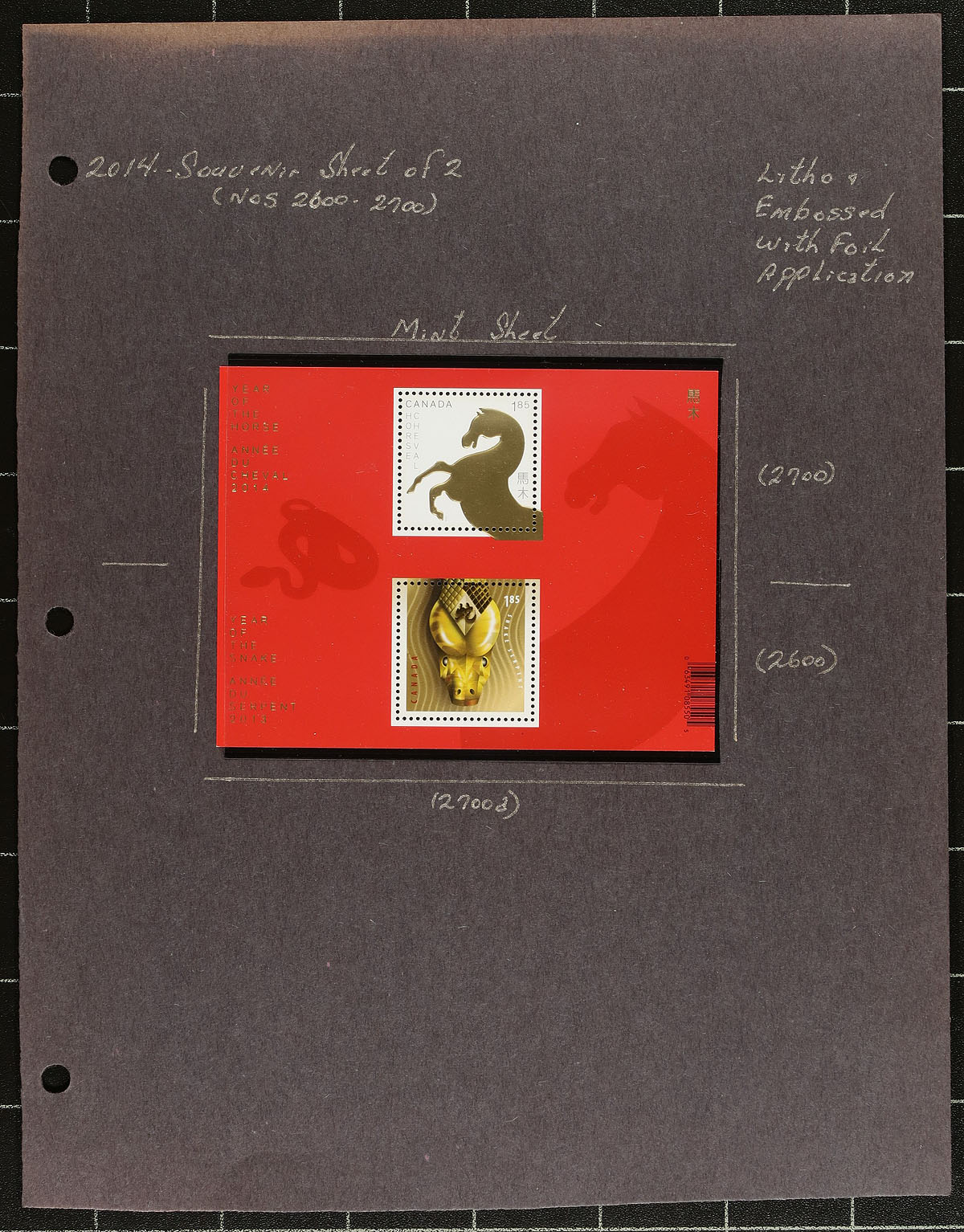 Attractive collection of primarily mint never hinged "Lunar New Year- Year of the Horse", January 2014, covering Unitrade #s 2699-2701, all in hingeless mounts in 18 well described pages. The collection contains mint and used singles, 2 mint sheets, matched set of mint and used plate blocks, mint and used souvenir sheets, booklets, and a few first day covers. Face value alone totals $95.00 alone! A lovely collection for any Canada collector. 2024 Unitrade =