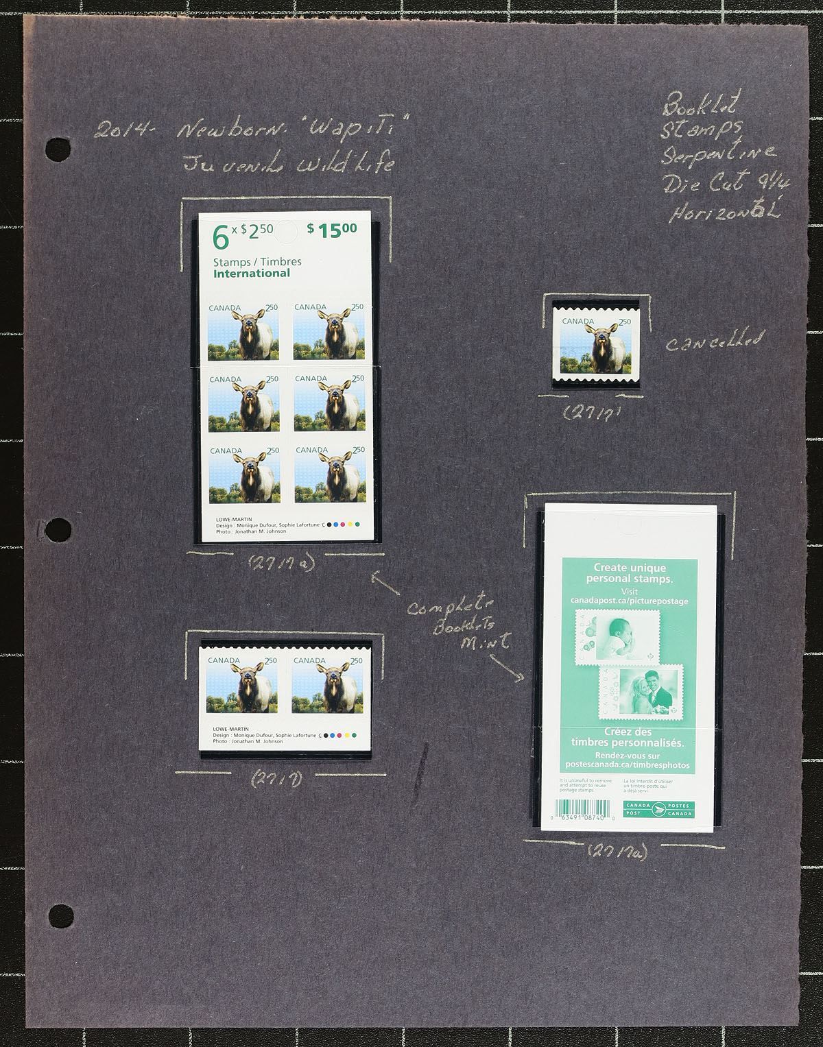 Valuable collection of primarily mint never hinged "Baby Wildlife" definitives, March 2014, covering Unitrade #s 2708-2714, all in hingeless mounts in roughly 20 well described pages. The collection primarily contains mint coil singles, pairs, strips of 4, booklet panes, mint and used souvenir sheet, and a few first day covers. The collection also contains #2708 "Insect" definitives, containing mint and used singles, plate blocks, sheetlets, and more. We note many items cataloguing $15.00 and up. Face value alone totals $322.00 (including 28x "P" stamps and noting several denominations $1.00 and up). A nice group for the definitive collector. 2024 Unitrade =