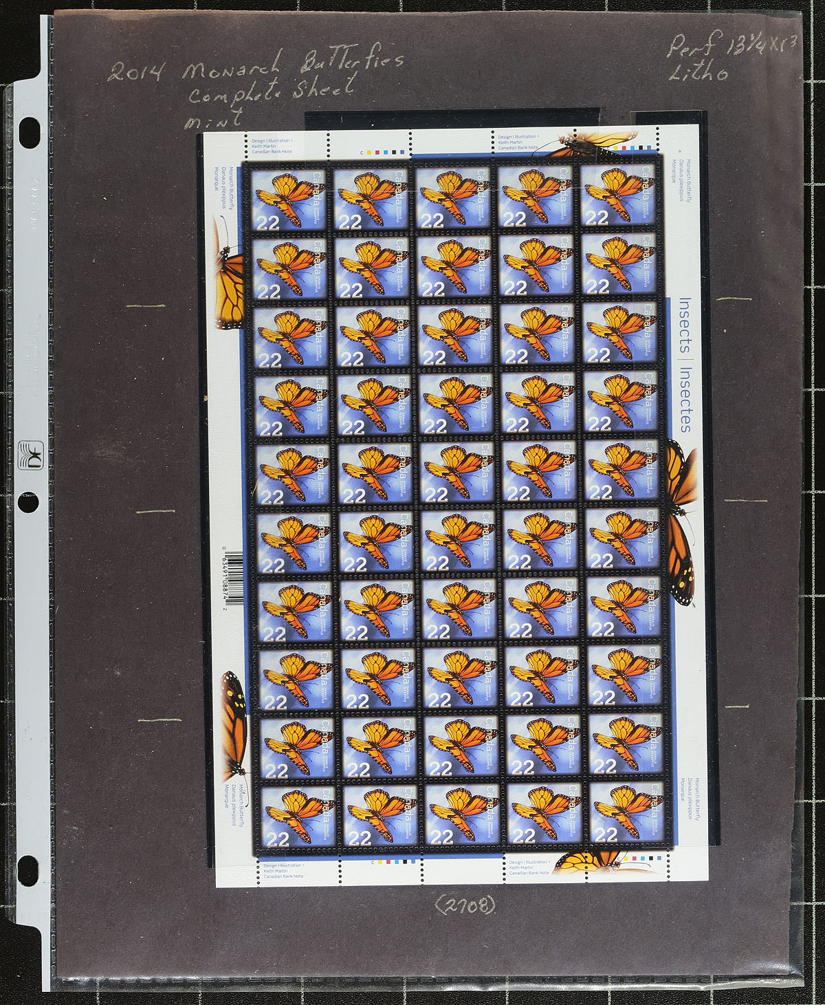 Valuable collection of primarily mint never hinged "Baby Wildlife" definitives, March 2014, covering Unitrade #s 2708-2714, all in hingeless mounts in roughly 20 well described pages. The collection primarily contains mint coil singles, pairs, strips of 4, booklet panes, mint and used souvenir sheet, and a few first day covers. The collection also contains #2708 "Insect" definitives, containing mint and used singles, plate blocks, sheetlets, and more. We note many items cataloguing $15.00 and up. Face value alone totals $322.00 (including 28x "P" stamps and noting several denominations $1.00 and up). A nice group for the definitive collector. 2024 Unitrade =