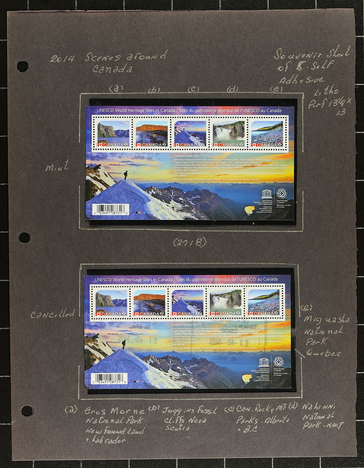 Group of primarily mint never hinged "Unesco World Heritage Sites in Canada" definitives, March 2014, covering Unitrade #s 2718-2723, all in hingeless mounts in 4 well described pages. The collection contains mint and used souvenir sheet, booklets, and mint and used singles. Face value alone totals $74.00 (counting 60x "P" stamps). A nice group for the definitive collector. Undervalued in Unitrade. 2024 Unitrade =