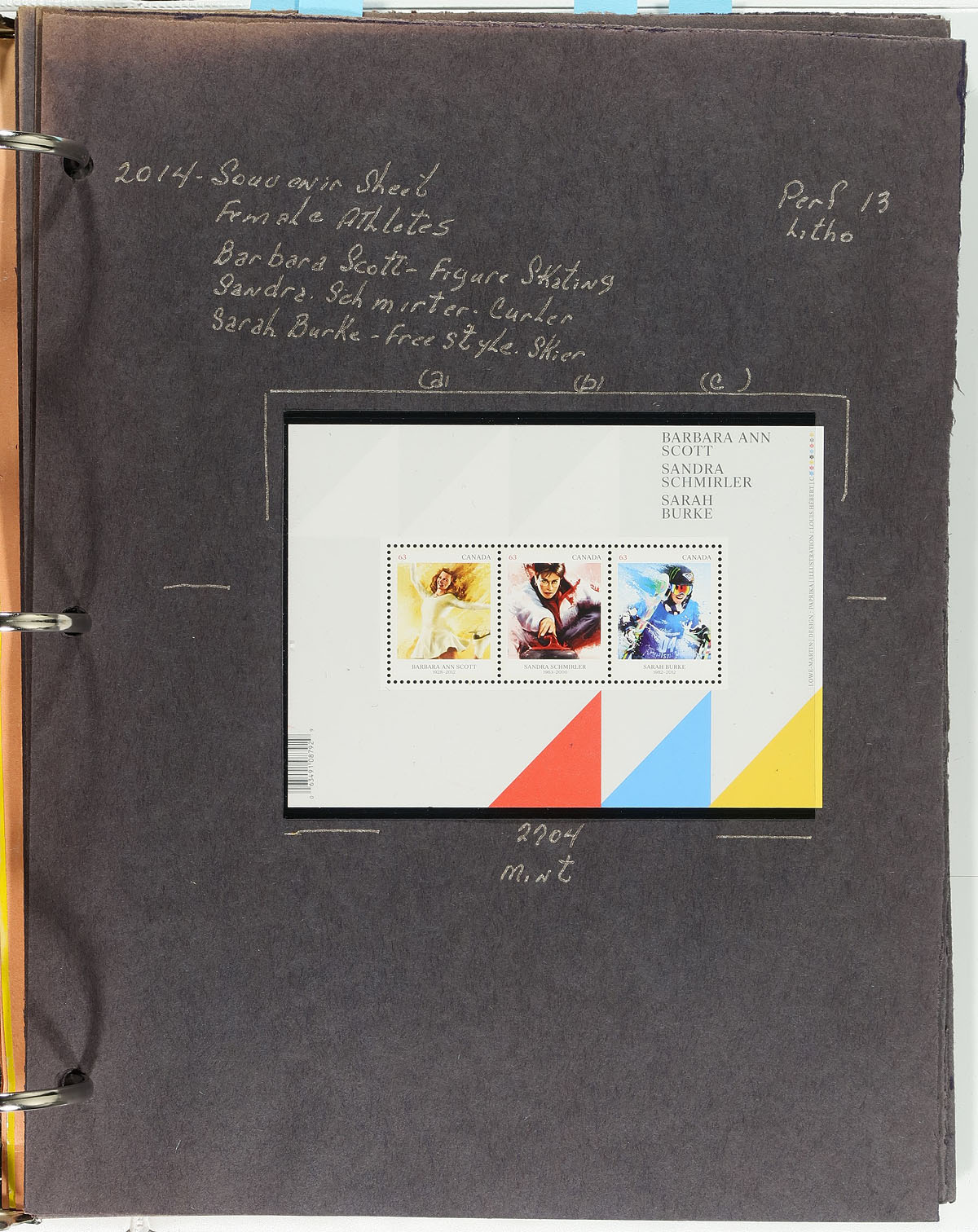 Lovely collection of primarily mint never hinged Canada, from January to February 2014, covering Unitrade #s 2702-2707, all in hingeless mounts in roughly 15 well described pages, housed in a binder. The collection contains primarily booklets, part booklet panes, and mint and used singles, along with a few souvenir sheets and first day covers. We note a few items cataloguing $10.00 and up. Face value alone totals $95.00. A nice group for all collectors. 2024 Unitrade =
