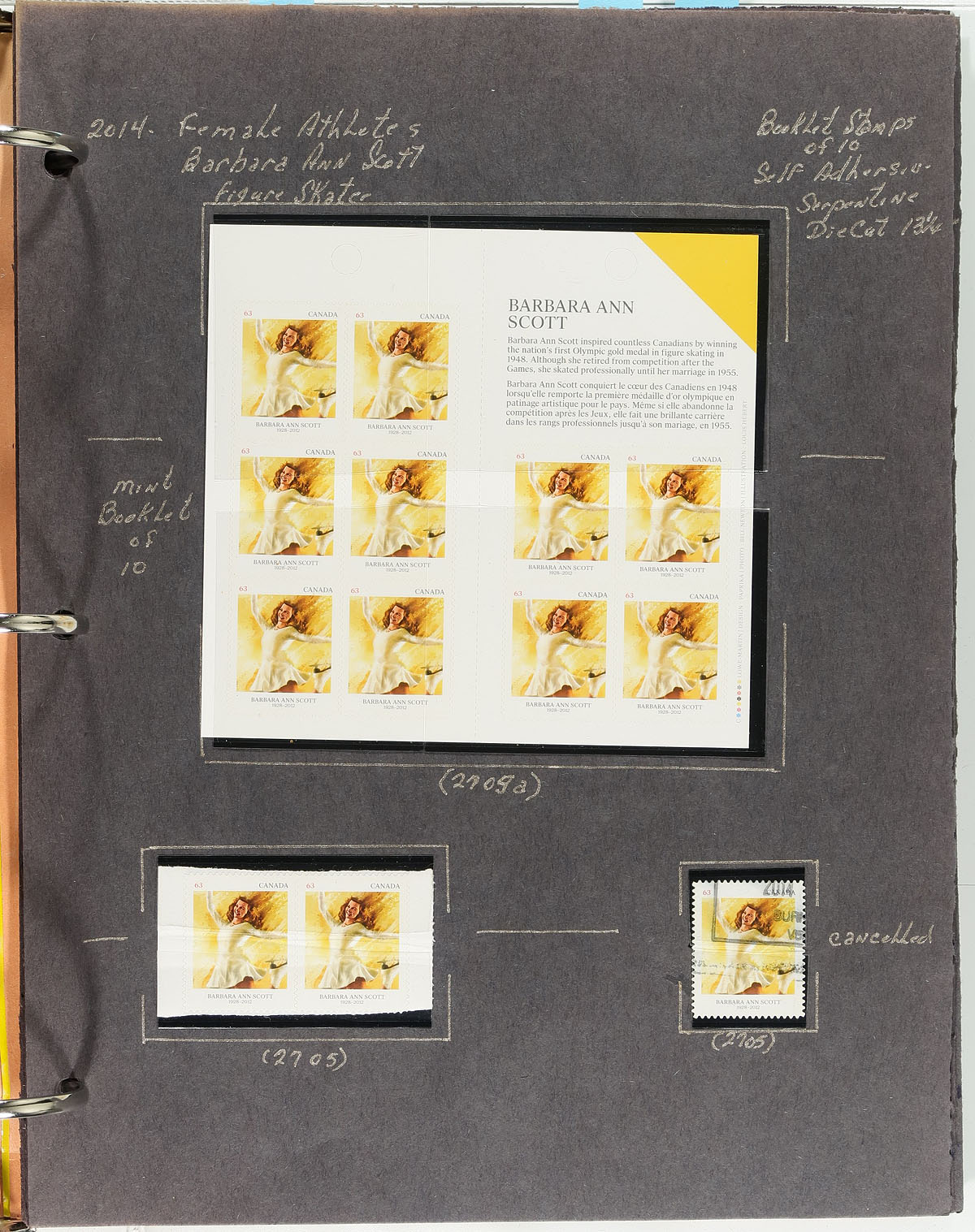 Lovely collection of primarily mint never hinged Canada, from January to February 2014, covering Unitrade #s 2702-2707, all in hingeless mounts in roughly 15 well described pages, housed in a binder. The collection contains primarily booklets, part booklet panes, and mint and used singles, along with a few souvenir sheets and first day covers. We note a few items cataloguing $10.00 and up. Face value alone totals $95.00. A nice group for all collectors. 2024 Unitrade =