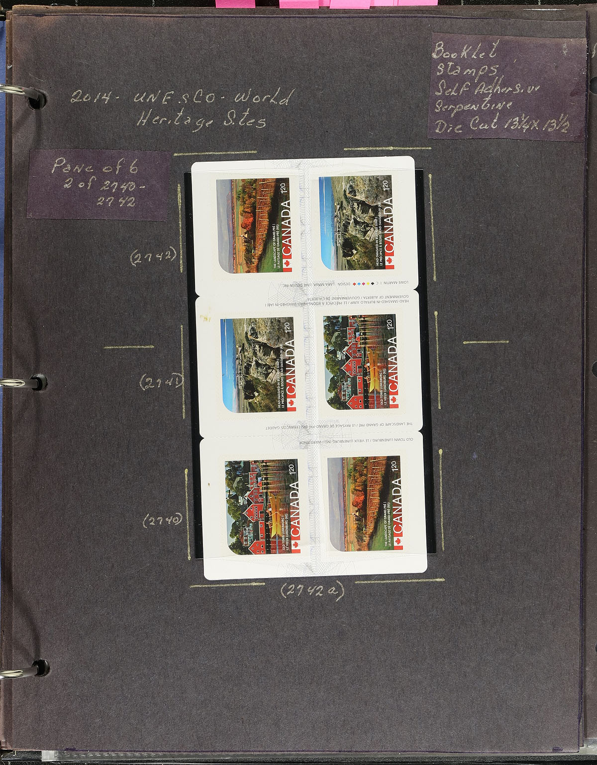 Collection of primarily mint never hinged Canada, from May 2014, covering Unitrade #s 2739-2747, all in hingeless mounts in roughly 20 well described pages, housed in a binder. The collection contains mint and used stamps (including booklet issues), matched set of plate blocks, booklets, souvenir sheets and sheetlets, and a few first day covers. We note a few items cataloguing $10.00 and up. Face value alone totals $195.00 (including 102x "P" stamps). A nice lot for all collectors. 2024 Unitrade =