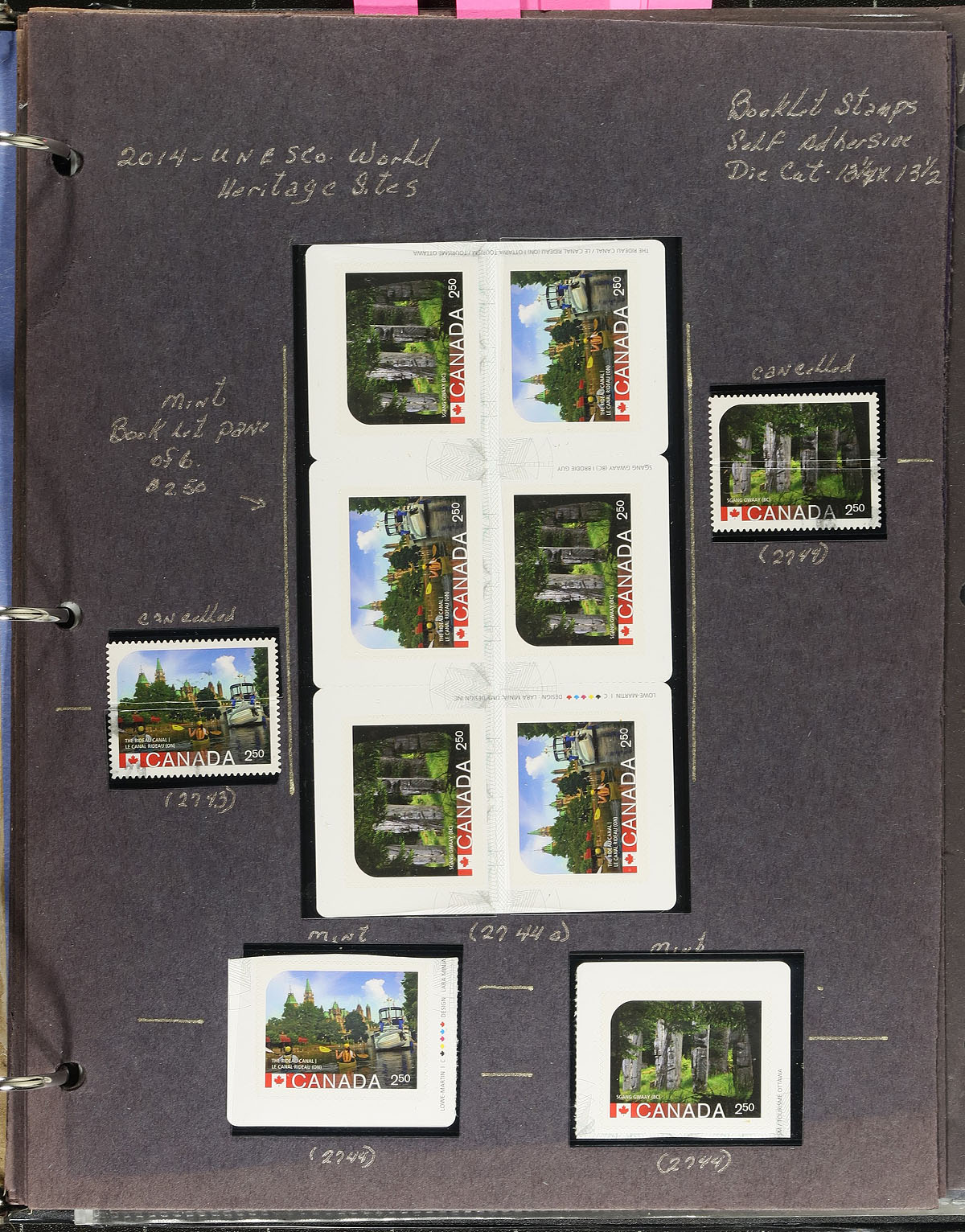 Collection of primarily mint never hinged Canada, from May 2014, covering Unitrade #s 2739-2747, all in hingeless mounts in roughly 20 well described pages, housed in a binder. The collection contains mint and used stamps (including booklet issues), matched set of plate blocks, booklets, souvenir sheets and sheetlets, and a few first day covers. We note a few items cataloguing $10.00 and up. Face value alone totals $195.00 (including 102x "P" stamps). A nice lot for all collectors. 2024 Unitrade =