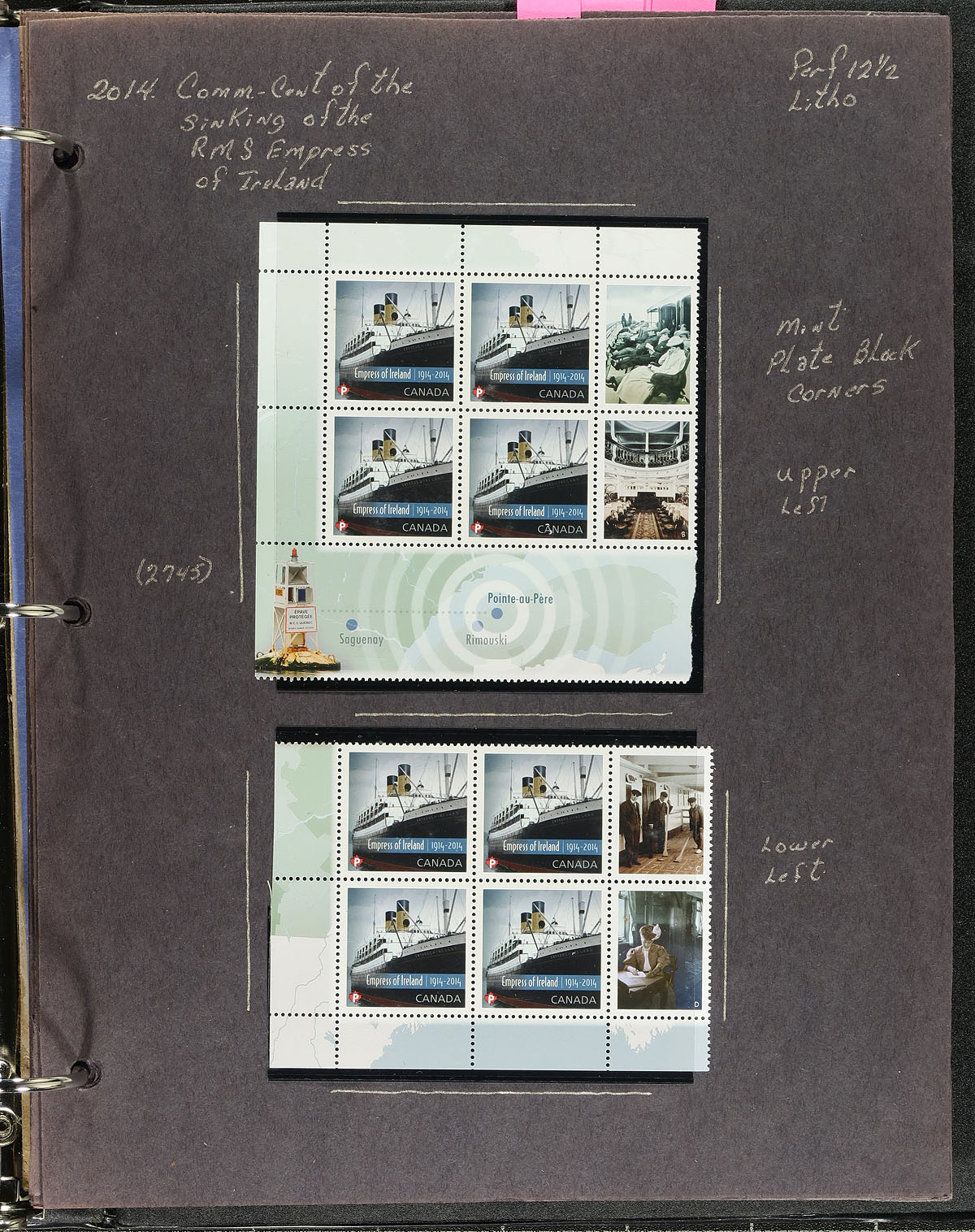 Collection of primarily mint never hinged Canada, from May 2014, covering Unitrade #s 2739-2747, all in hingeless mounts in roughly 20 well described pages, housed in a binder. The collection contains mint and used stamps (including booklet issues), matched set of plate blocks, booklets, souvenir sheets and sheetlets, and a few first day covers. We note a few items cataloguing $10.00 and up. Face value alone totals $195.00 (including 102x "P" stamps). A nice lot for all collectors. 2024 Unitrade =