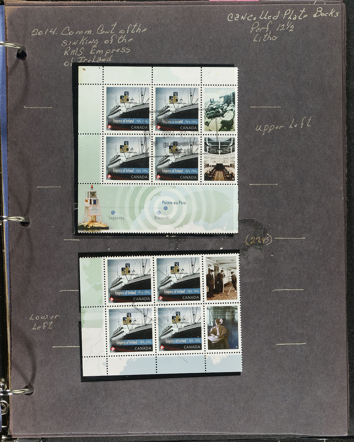 Collection of primarily mint never hinged Canada, from May 2014, covering Unitrade #s 2739-2747, all in hingeless mounts in roughly 20 well described pages, housed in a binder. The collection contains mint and used stamps (including booklet issues), matched set of plate blocks, booklets, souvenir sheets and sheetlets, and a few first day covers. We note a few items cataloguing $10.00 and up. Face value alone totals $195.00 (including 102x "P" stamps). A nice lot for all collectors. 2024 Unitrade =