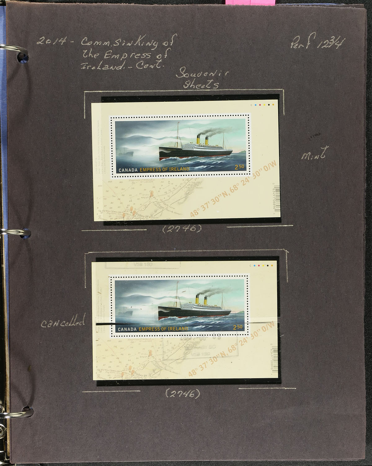 Collection of primarily mint never hinged Canada, from May 2014, covering Unitrade #s 2739-2747, all in hingeless mounts in roughly 20 well described pages, housed in a binder. The collection contains mint and used stamps (including booklet issues), matched set of plate blocks, booklets, souvenir sheets and sheetlets, and a few first day covers. We note a few items cataloguing $10.00 and up. Face value alone totals $195.00 (including 102x "P" stamps). A nice lot for all collectors. 2024 Unitrade =