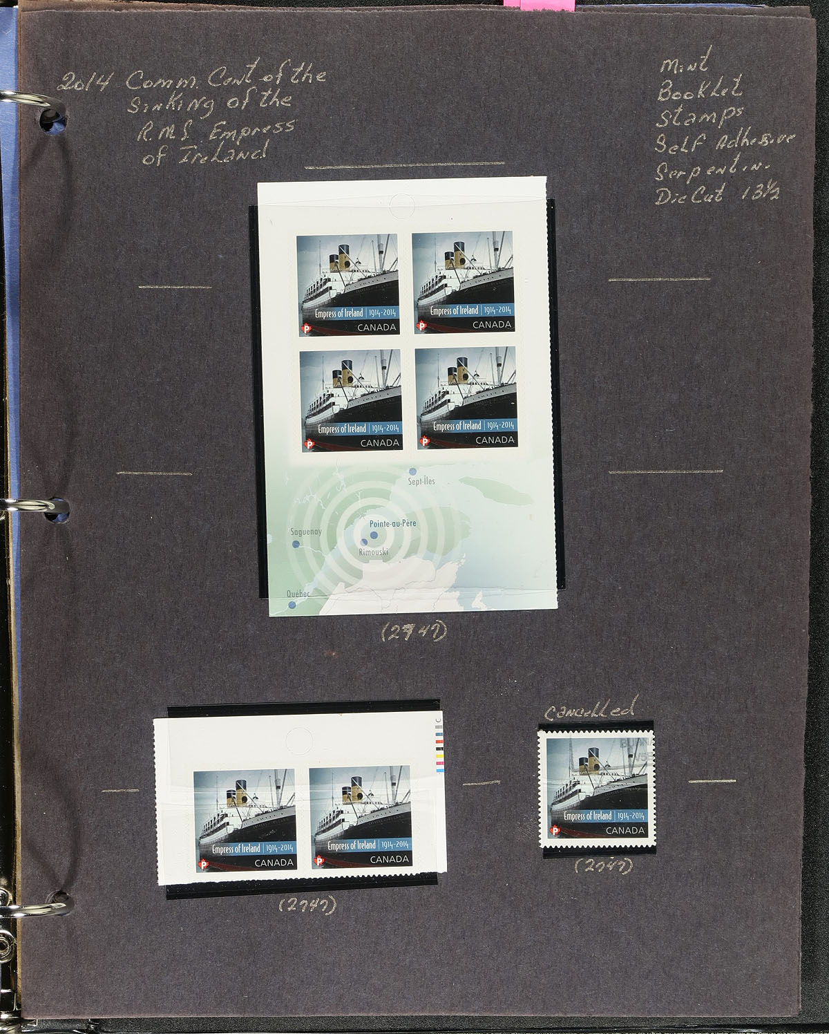 Collection of primarily mint never hinged Canada, from May 2014, covering Unitrade #s 2739-2747, all in hingeless mounts in roughly 20 well described pages, housed in a binder. The collection contains mint and used stamps (including booklet issues), matched set of plate blocks, booklets, souvenir sheets and sheetlets, and a few first day covers. We note a few items cataloguing $10.00 and up. Face value alone totals $195.00 (including 102x "P" stamps). A nice lot for all collectors. 2024 Unitrade =