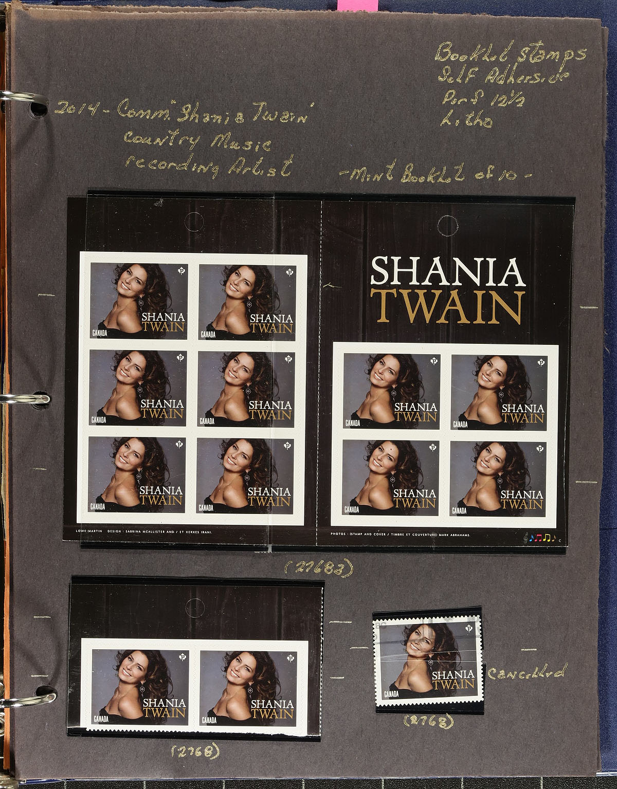 Lovely collection of primarily mint never hinged "Canadian Country Artists", July 2014, covering Unitrade #s 2765-2770, all in hingeless mounts in roughly 15 well described pages, housed in a binder. The collection contains primarily complete booklets, part panes, mint and used booklet stamps, along with a few souvenir sheets and first day covers. We note a few items cataloguing $10.00 and up. Face value alone totals $189.00 (including 153x "P" stamps). A nice lot for all collectors. 2024 Unitrade =