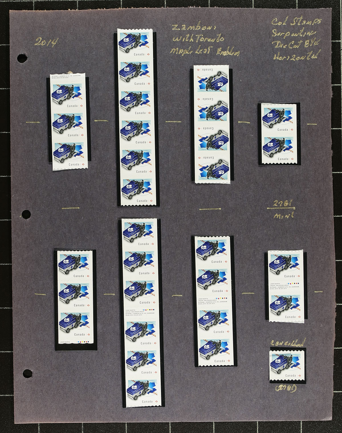 Collection of primarily mint never hinged "NHL Zamboni Ice Resurfacing Machines", October 2014, covering Unitrade #s 2778-2785, all in hingeless mounts in roughly 15 well described pages. The collection contains primarily coil singles, pairs, and strips, along with a few souvenir sheets. Face value alone totals $286.00 (including 231x "P" stamps). A terrific lot for coil and Canada collectors. 2024 Unitrade =
