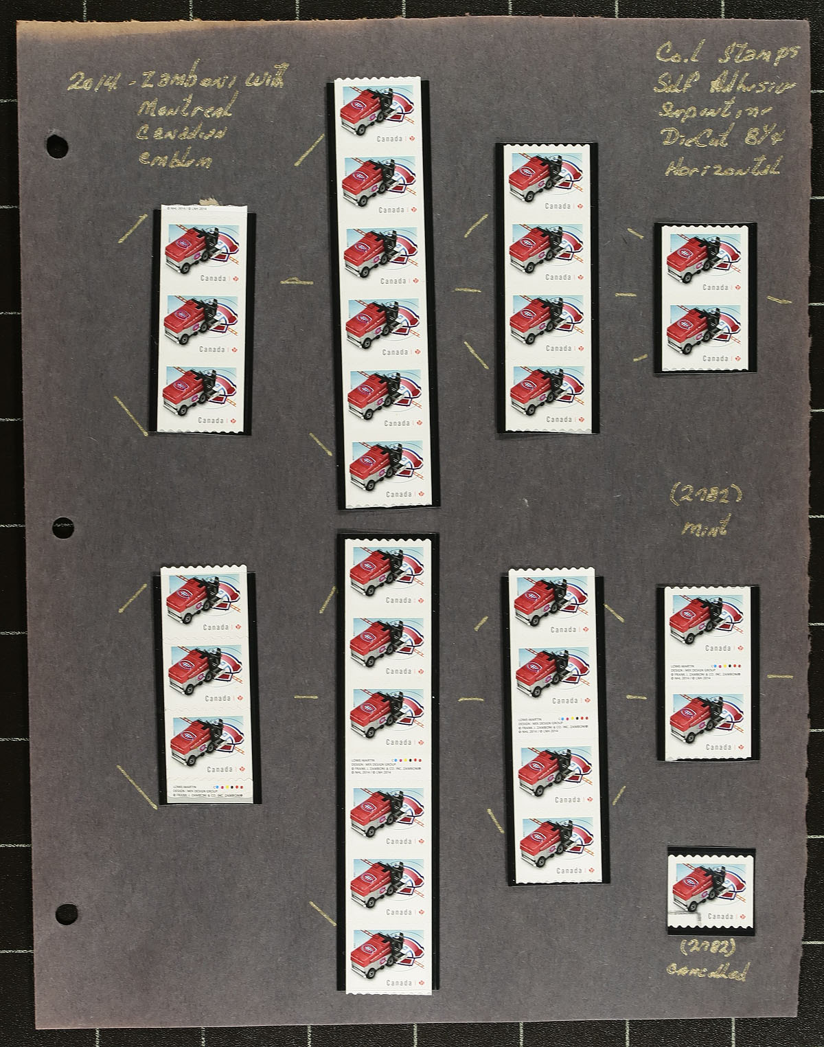 Collection of primarily mint never hinged "NHL Zamboni Ice Resurfacing Machines", October 2014, covering Unitrade #s 2778-2785, all in hingeless mounts in roughly 15 well described pages. The collection contains primarily coil singles, pairs, and strips, along with a few souvenir sheets. Face value alone totals $286.00 (including 231x "P" stamps). A terrific lot for coil and Canada collectors. 2024 Unitrade =