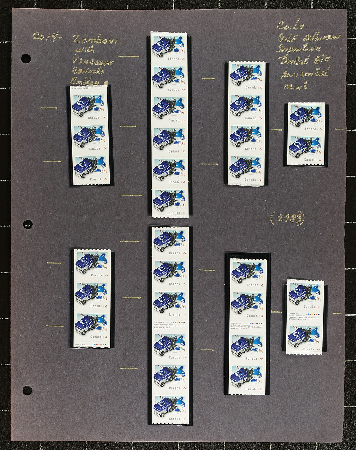 Collection of primarily mint never hinged "NHL Zamboni Ice Resurfacing Machines", October 2014, covering Unitrade #s 2778-2785, all in hingeless mounts in roughly 15 well described pages. The collection contains primarily coil singles, pairs, and strips, along with a few souvenir sheets. Face value alone totals $286.00 (including 231x "P" stamps). A terrific lot for coil and Canada collectors. 2024 Unitrade =