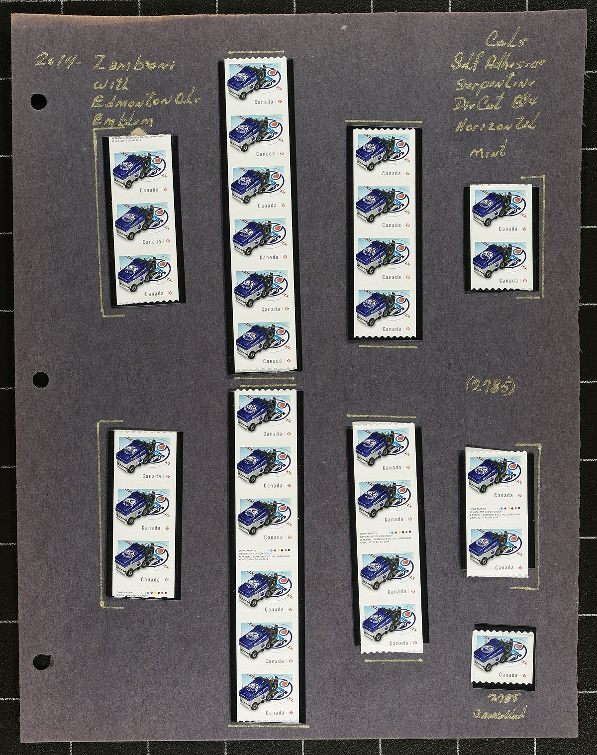 Collection of primarily mint never hinged "NHL Zamboni Ice Resurfacing Machines", October 2014, covering Unitrade #s 2778-2785, all in hingeless mounts in roughly 15 well described pages. The collection contains primarily coil singles, pairs, and strips, along with a few souvenir sheets. Face value alone totals $286.00 (including 231x "P" stamps). A terrific lot for coil and Canada collectors. 2024 Unitrade =
