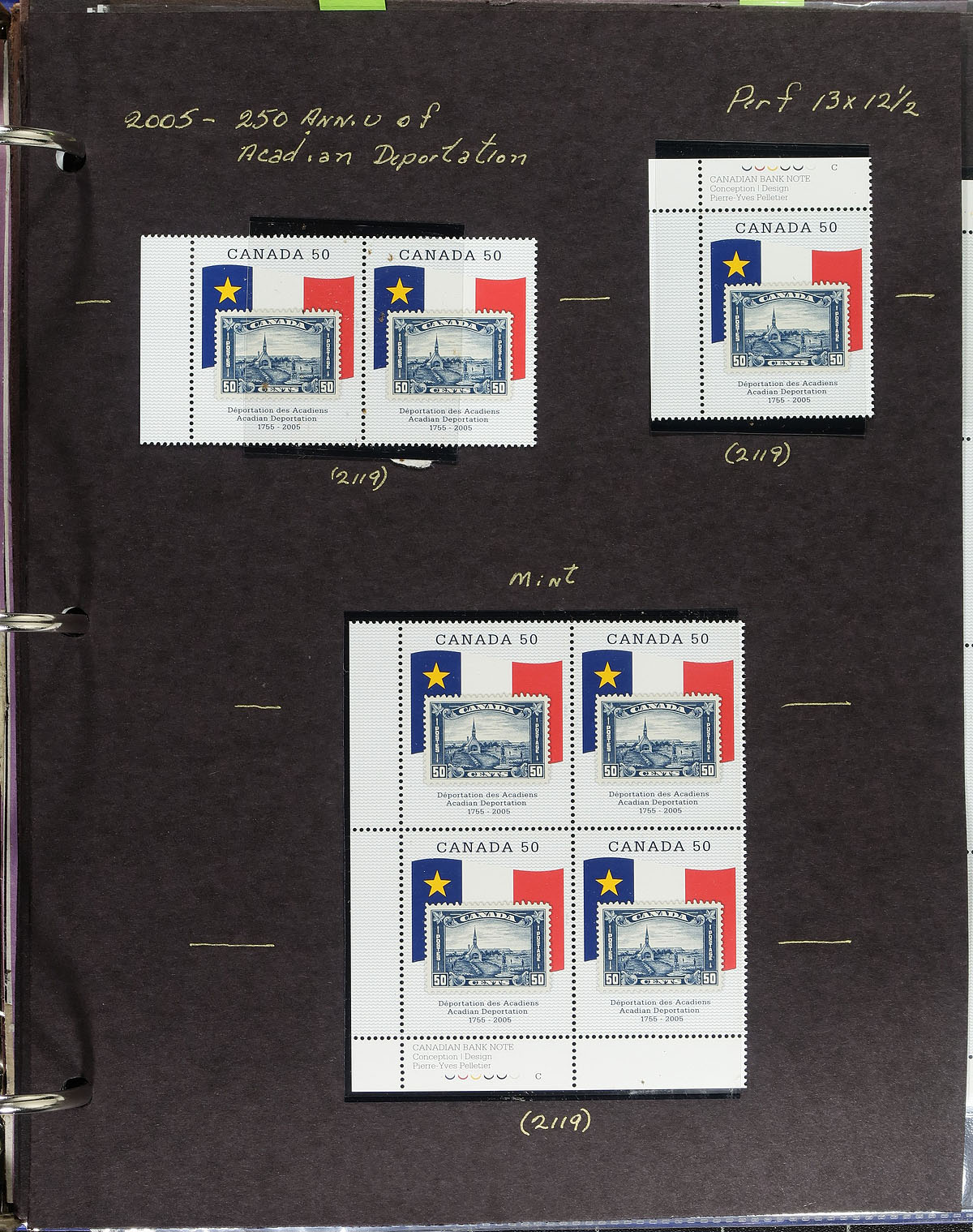 Mint never hinged collection of Canada, August to October of 2005, covering Unitrade #s 2118-2121, all in hingeless mounts in roughly 20 well described pages, housed in a binder. The collection contains mint and used singles, mint and used souvenir sheets and sheetlets, booklets, matched sets of plate blocks, and a few first day covers. We note a few items cataloguing $10.00 and up. Face value alone totals $65.00. A lovely lot for all collectors. 2024 Unitrade =
