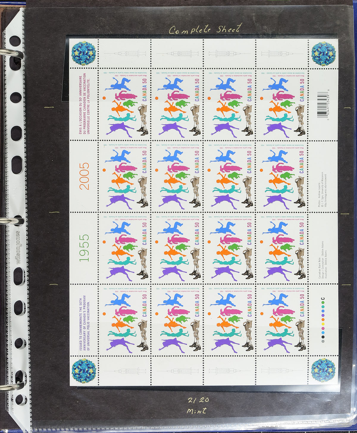 Mint never hinged collection of Canada, August to October of 2005, covering Unitrade #s 2118-2121, all in hingeless mounts in roughly 20 well described pages, housed in a binder. The collection contains mint and used singles, mint and used souvenir sheets and sheetlets, booklets, matched sets of plate blocks, and a few first day covers. We note a few items cataloguing $10.00 and up. Face value alone totals $65.00. A lovely lot for all collectors. 2024 Unitrade =