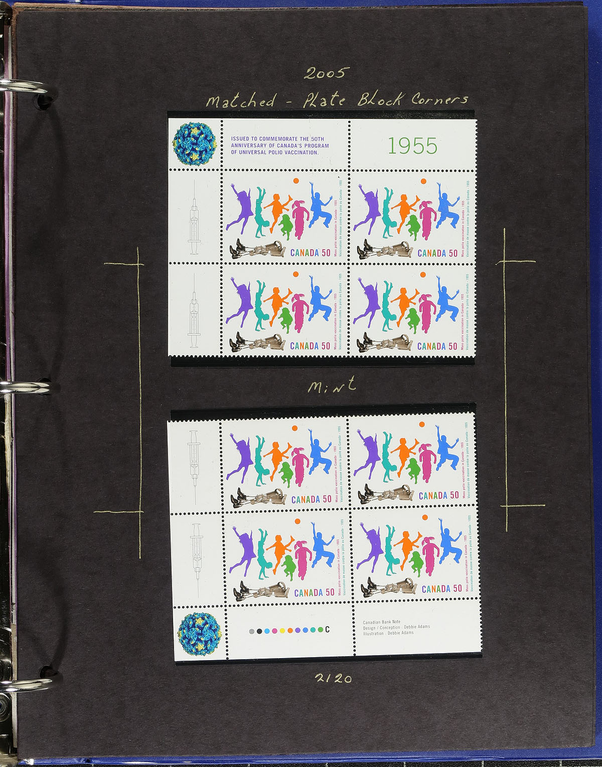 Mint never hinged collection of Canada, August to October of 2005, covering Unitrade #s 2118-2121, all in hingeless mounts in roughly 20 well described pages, housed in a binder. The collection contains mint and used singles, mint and used souvenir sheets and sheetlets, booklets, matched sets of plate blocks, and a few first day covers. We note a few items cataloguing $10.00 and up. Face value alone totals $65.00. A lovely lot for all collectors. 2024 Unitrade =