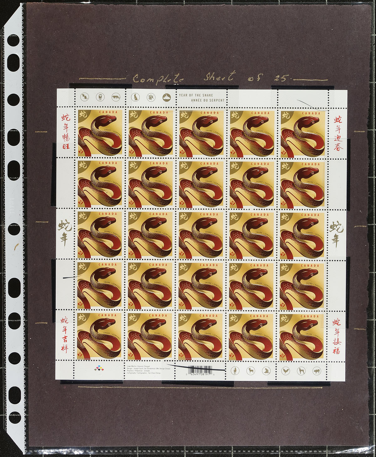 Lovely collection of primarily mint never hinged "Lunar New Year- Year of the Snake", January 2013, covering Unitrade #s 2599-2601, all in hingeless mounts in over 20 well described pages. The collection contains mint and used singles, 2 mint sheets, matched set of mint and used plate blocks, mint and used souvenir sheets, booklets, and roughly 10 first day covers (including a few with Lower Mainland B.C. postmarks). Face value alone totals $128.00 (includes 80x "P" stamps). A lovely collection for any Canada collector. 2024 Unitrade =