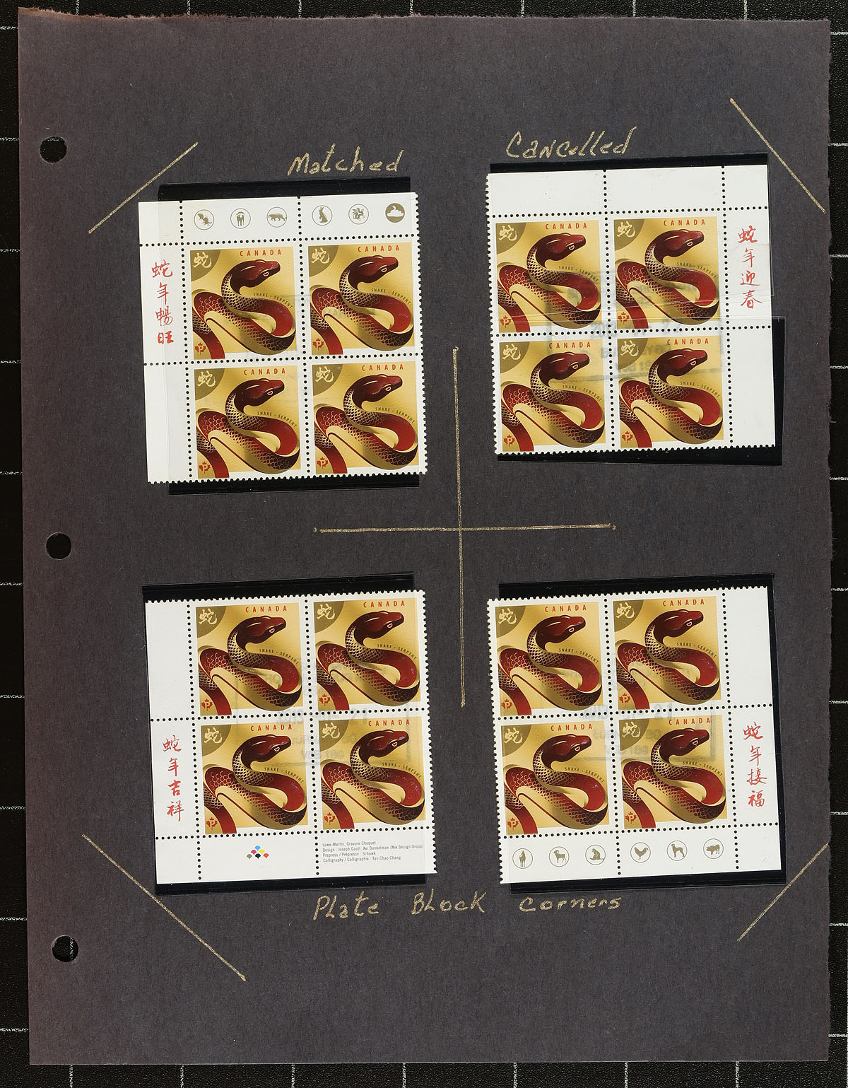 Lovely collection of primarily mint never hinged "Lunar New Year- Year of the Snake", January 2013, covering Unitrade #s 2599-2601, all in hingeless mounts in over 20 well described pages. The collection contains mint and used singles, 2 mint sheets, matched set of mint and used plate blocks, mint and used souvenir sheets, booklets, and roughly 10 first day covers (including a few with Lower Mainland B.C. postmarks). Face value alone totals $128.00 (includes 80x "P" stamps). A lovely collection for any Canada collector. 2024 Unitrade =