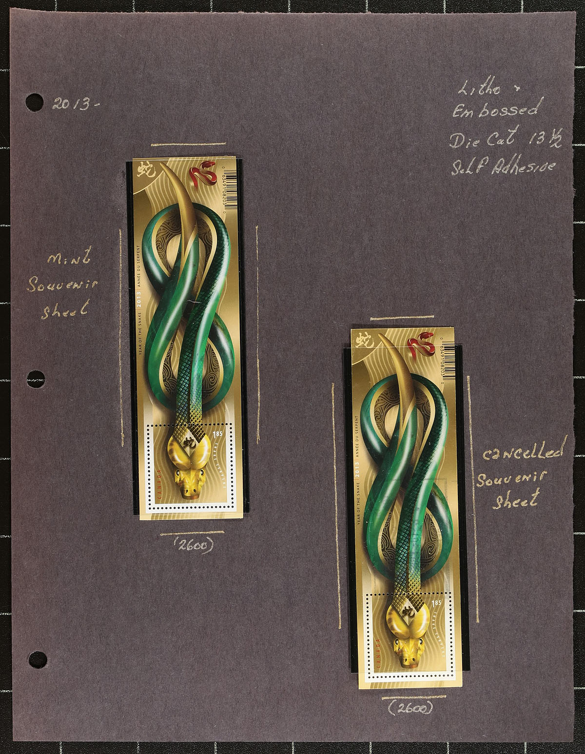 Lovely collection of primarily mint never hinged "Lunar New Year- Year of the Snake", January 2013, covering Unitrade #s 2599-2601, all in hingeless mounts in over 20 well described pages. The collection contains mint and used singles, 2 mint sheets, matched set of mint and used plate blocks, mint and used souvenir sheets, booklets, and roughly 10 first day covers (including a few with Lower Mainland B.C. postmarks). Face value alone totals $128.00 (includes 80x "P" stamps). A lovely collection for any Canada collector. 2024 Unitrade =