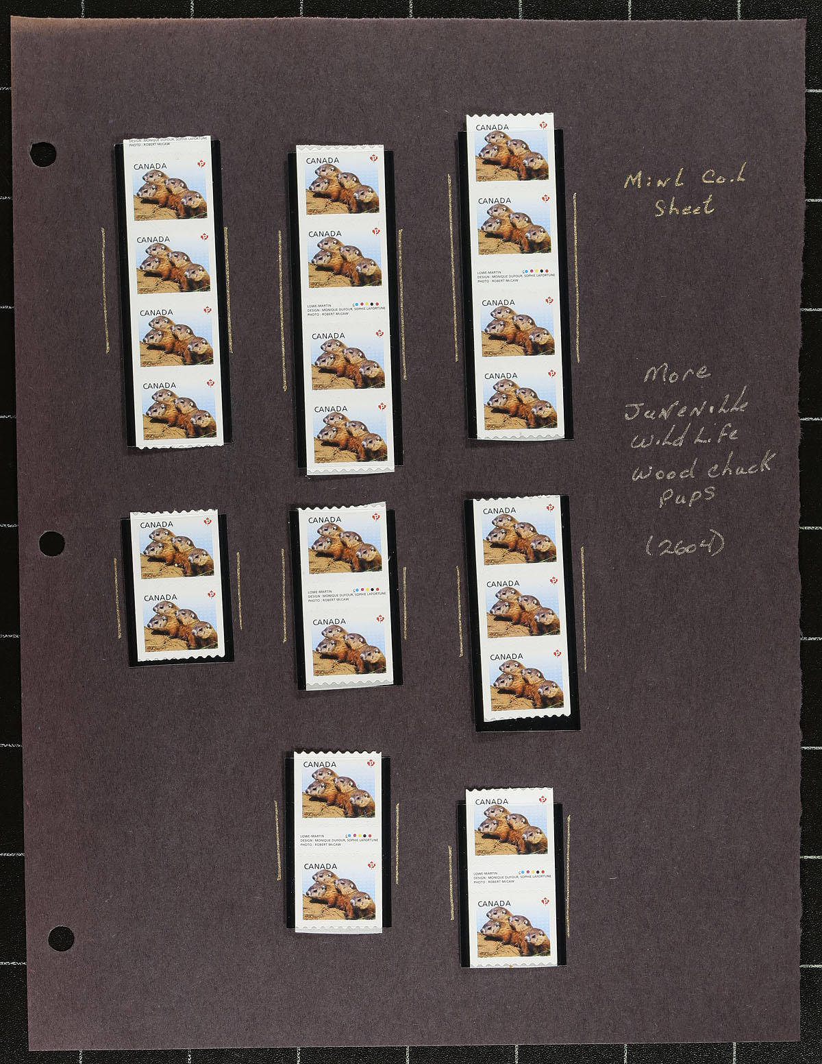 Collection of primarily mint never hinged "Baby Wildlife" definitives, January 2013, covering Unitrade #s 2602-2610, all in hingeless mounts in roughly 15 well described pages. The collection contains mint coil singles, pairs, strips of 4, booklet panes, mint and used souvenir sheet. Face value alone totals $150.00 (including 34x "P" stamps). A nice group for the definitive collector. 2024 Unitrade =