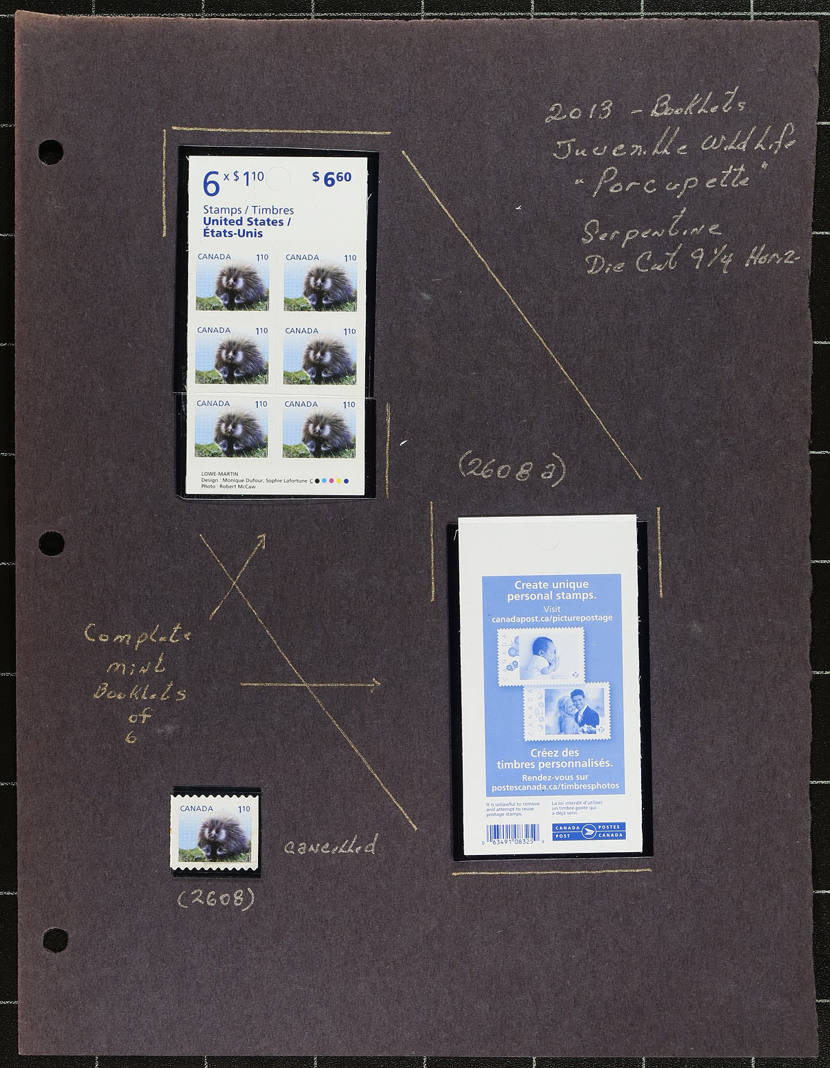 Collection of primarily mint never hinged "Baby Wildlife" definitives, January 2013, covering Unitrade #s 2602-2610, all in hingeless mounts in roughly 15 well described pages. The collection contains mint coil singles, pairs, strips of 4, booklet panes, mint and used souvenir sheet. Face value alone totals $150.00 (including 34x "P" stamps). A nice group for the definitive collector. 2024 Unitrade =