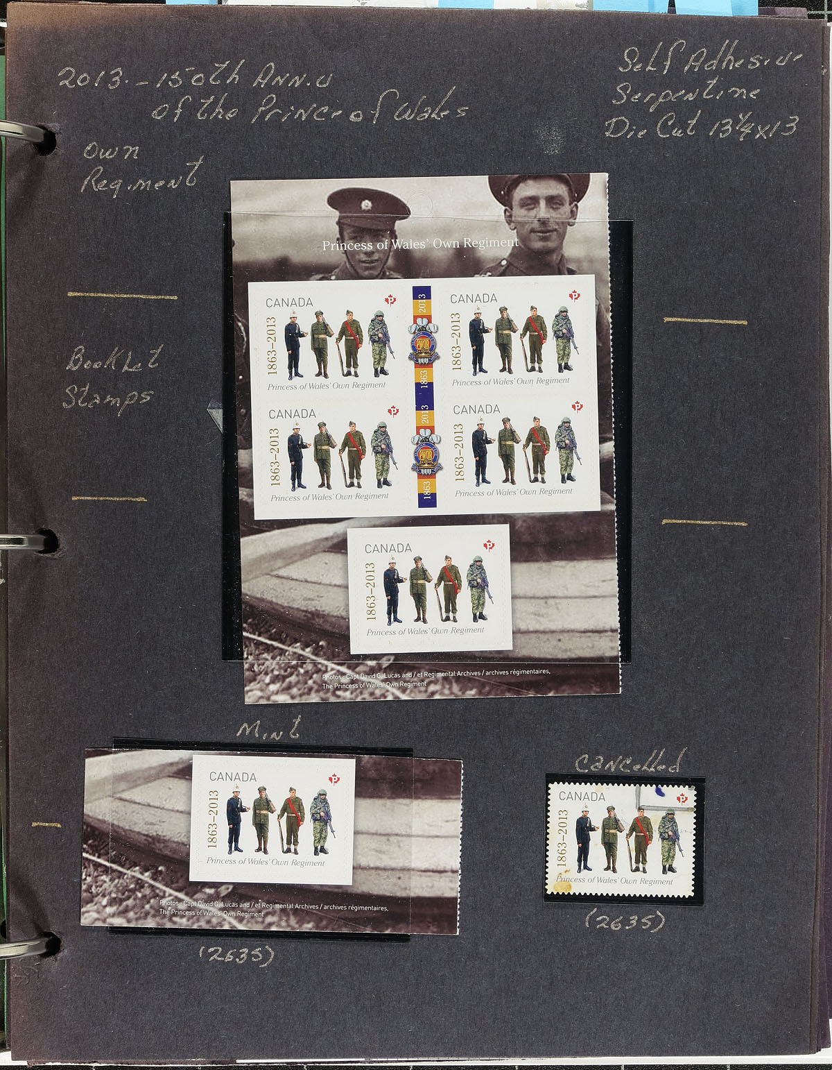 Collection of primarily mint never hinged Canada, from April to June 2013, covering Unitrade #s 2635-2651, all in hingeless mounts in over 30 well described pages housed in a binder. The collection contains mint and used singles (including booklet stamps), souvenir sheets, sheetlets, matched plate blocks, booklets, and a few first day covers. We note several items cataloguing $10.00 and up. Face value alone totals $352.00 (including 284x "P" stamps). A terrific lot for all collectors. 2024 Unitrade =