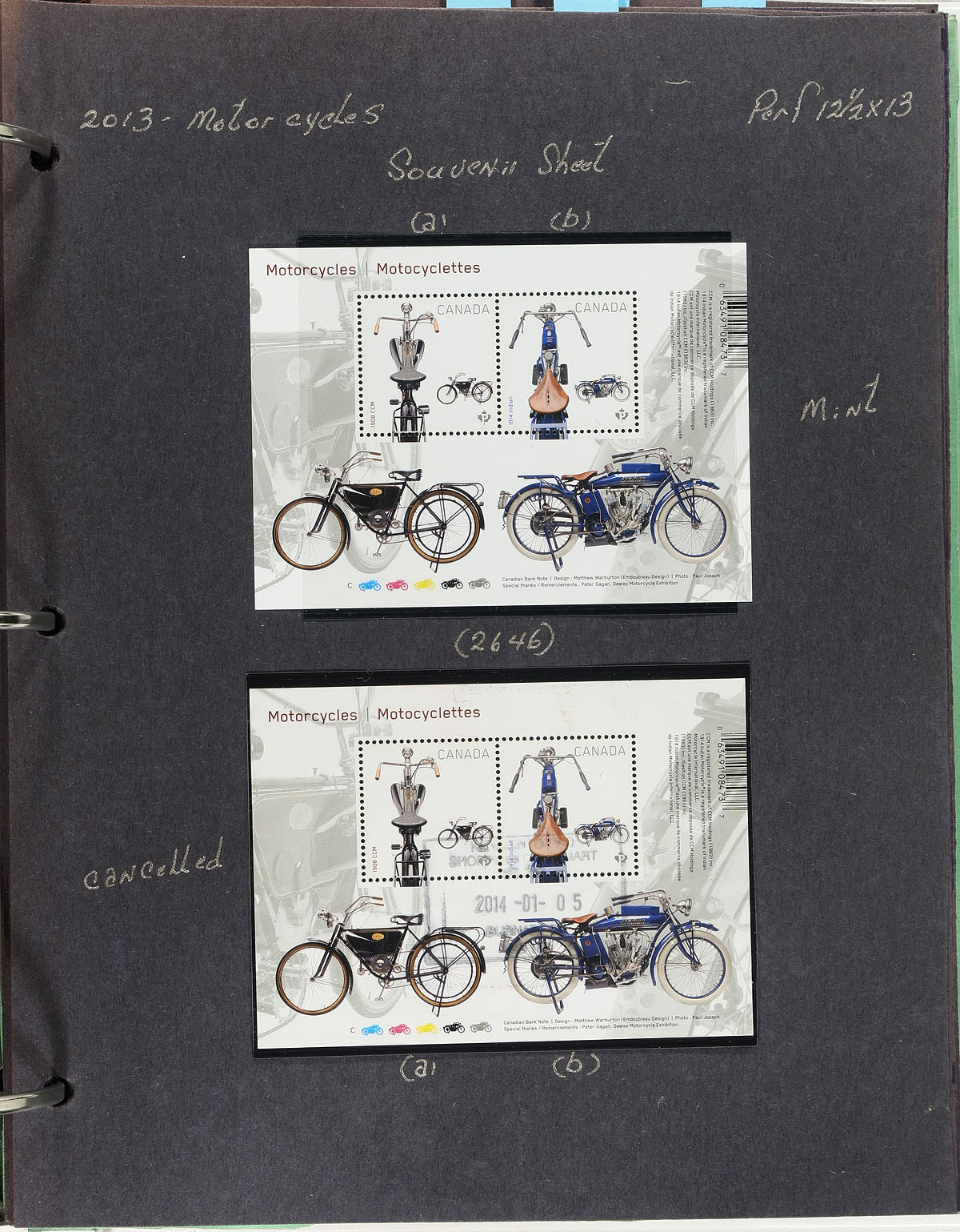 Collection of primarily mint never hinged Canada, from April to June 2013, covering Unitrade #s 2635-2651, all in hingeless mounts in over 30 well described pages housed in a binder. The collection contains mint and used singles (including booklet stamps), souvenir sheets, sheetlets, matched plate blocks, booklets, and a few first day covers. We note several items cataloguing $10.00 and up. Face value alone totals $352.00 (including 284x "P" stamps). A terrific lot for all collectors. 2024 Unitrade =