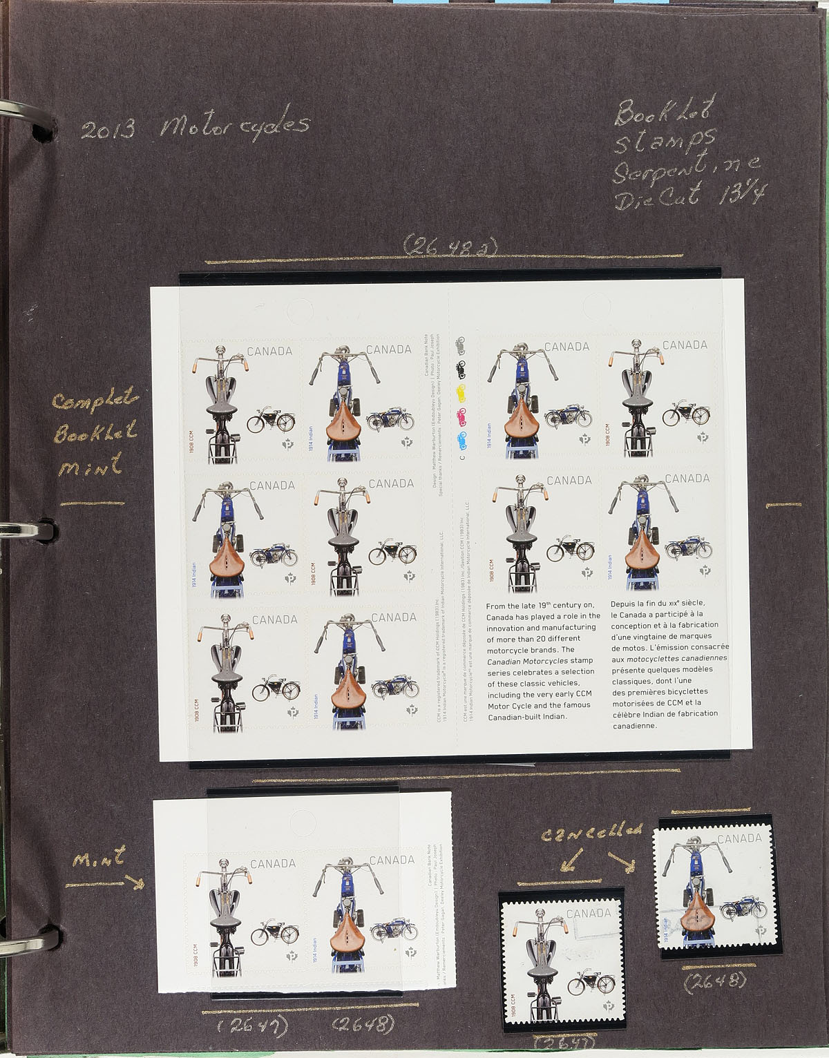 Collection of primarily mint never hinged Canada, from April to June 2013, covering Unitrade #s 2635-2651, all in hingeless mounts in over 30 well described pages housed in a binder. The collection contains mint and used singles (including booklet stamps), souvenir sheets, sheetlets, matched plate blocks, booklets, and a few first day covers. We note several items cataloguing $10.00 and up. Face value alone totals $352.00 (including 284x "P" stamps). A terrific lot for all collectors. 2024 Unitrade =