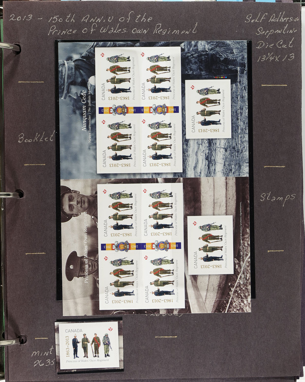 Collection of primarily mint never hinged Canada, from April to June 2013, covering Unitrade #s 2635-2651, all in hingeless mounts in over 30 well described pages housed in a binder. The collection contains mint and used singles (including booklet stamps), souvenir sheets, sheetlets, matched plate blocks, booklets, and a few first day covers. We note several items cataloguing $10.00 and up. Face value alone totals $352.00 (including 284x "P" stamps). A terrific lot for all collectors. 2024 Unitrade =