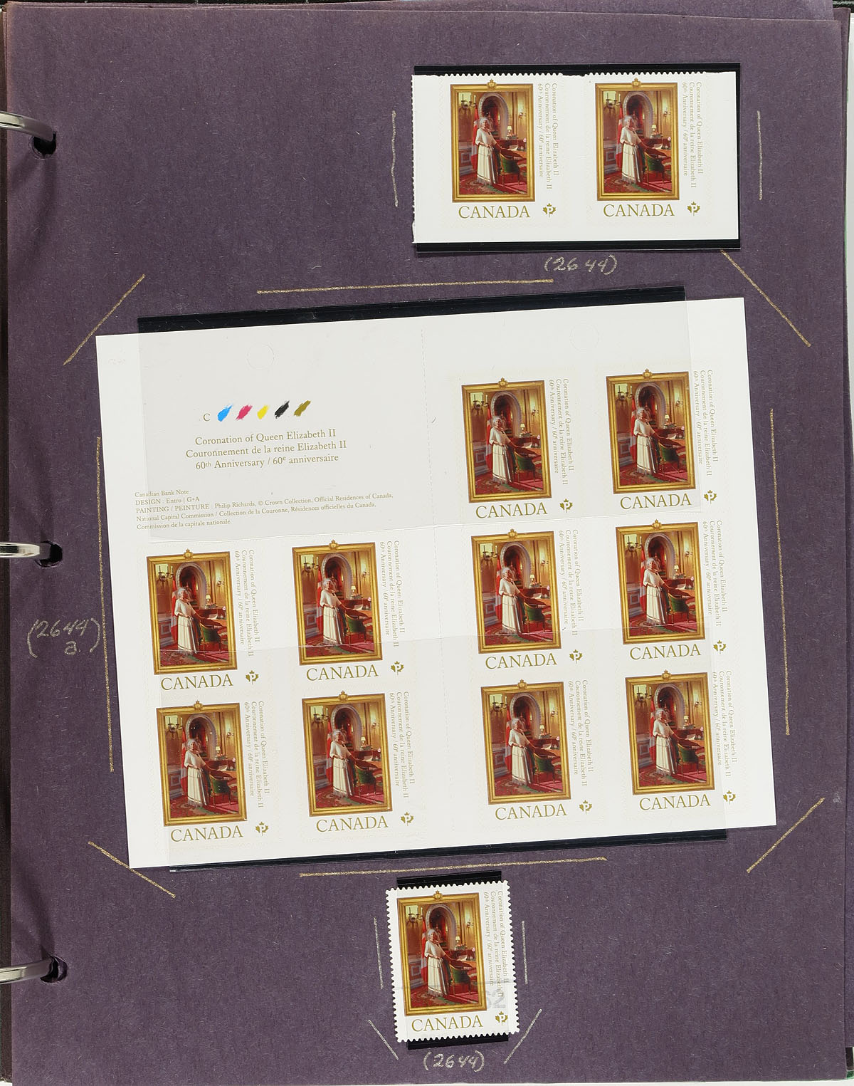 Collection of primarily mint never hinged Canada, from April to June 2013, covering Unitrade #s 2635-2651, all in hingeless mounts in over 30 well described pages housed in a binder. The collection contains mint and used singles (including booklet stamps), souvenir sheets, sheetlets, matched plate blocks, booklets, and a few first day covers. We note several items cataloguing $10.00 and up. Face value alone totals $352.00 (including 284x "P" stamps). A terrific lot for all collectors. 2024 Unitrade =