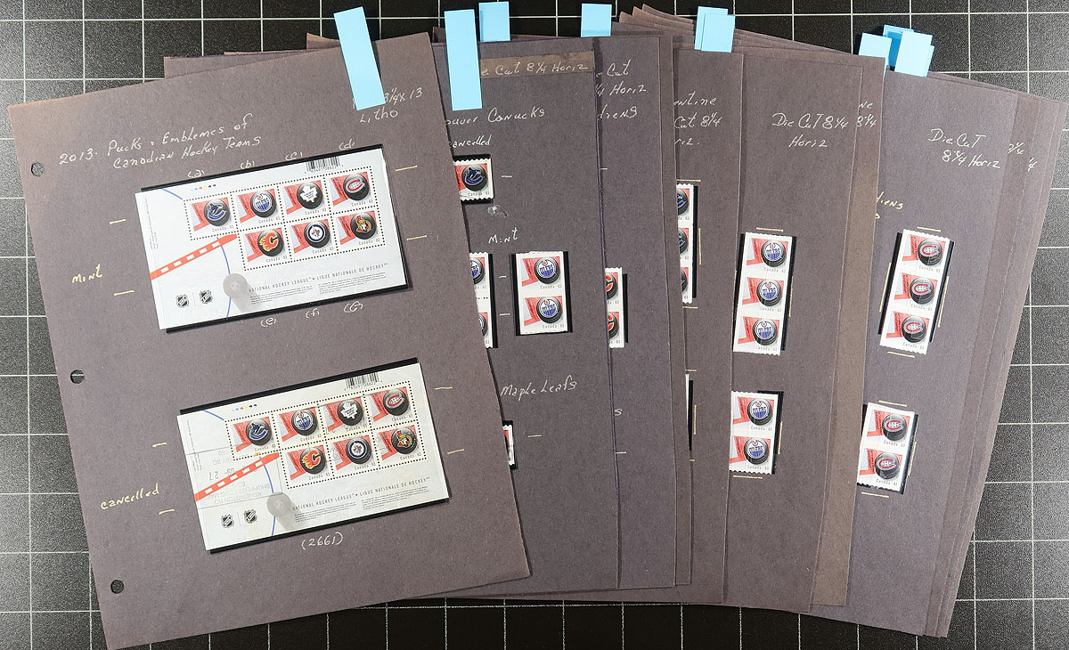 Attractive and seldom seen collection of primarily mint never hinged "NHL Team Logos", September 2013, covering Unitrade #s 2661-2668, all in hingelss mounts on 11 well described pages. The lot contains almost exclusively coil singles, pairs, and strips of 4 for each issue, along with a mint and used souvenir sheet. Face value alone totals $114. A great lot for Canada and topical collectors. Undervalued in the catalogue! 2024 Unitrade =