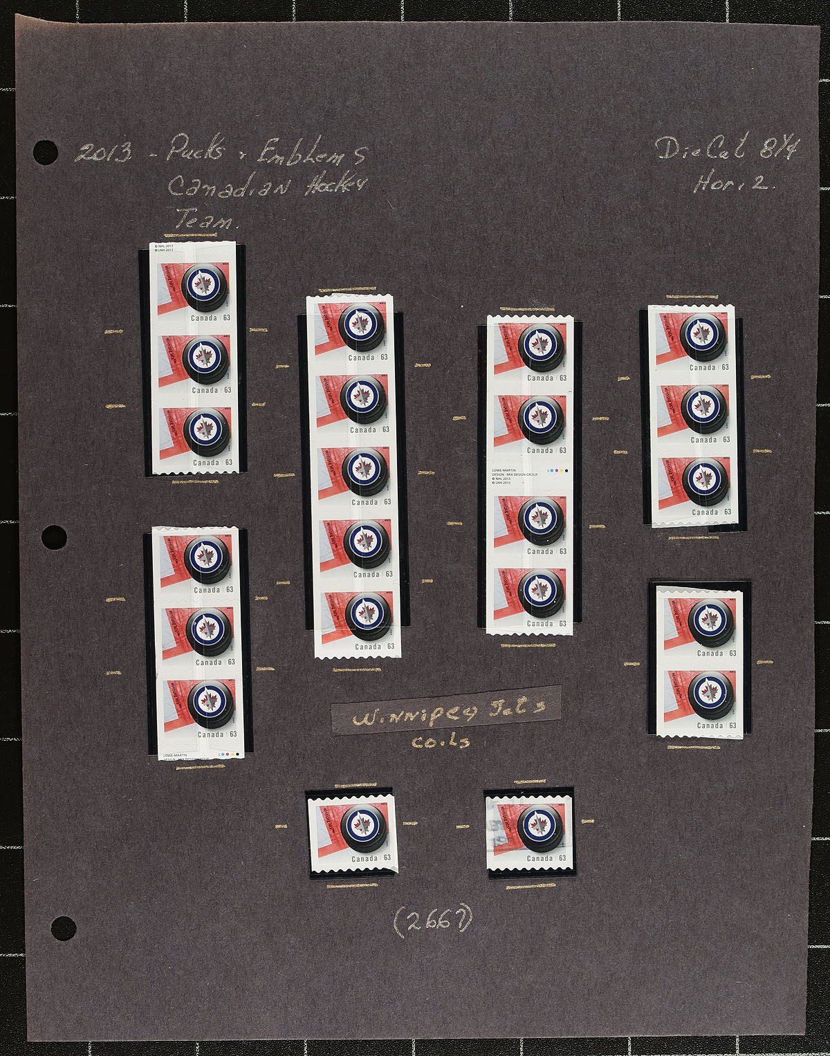 Attractive and seldom seen collection of primarily mint never hinged "NHL Team Logos", September 2013, covering Unitrade #s 2661-2668, all in hingelss mounts on 11 well described pages. The lot contains almost exclusively coil singles, pairs, and strips of 4 for each issue, along with a mint and used souvenir sheet. Face value alone totals $114. A great lot for Canada and topical collectors. Undervalued in the catalogue! 2024 Unitrade =