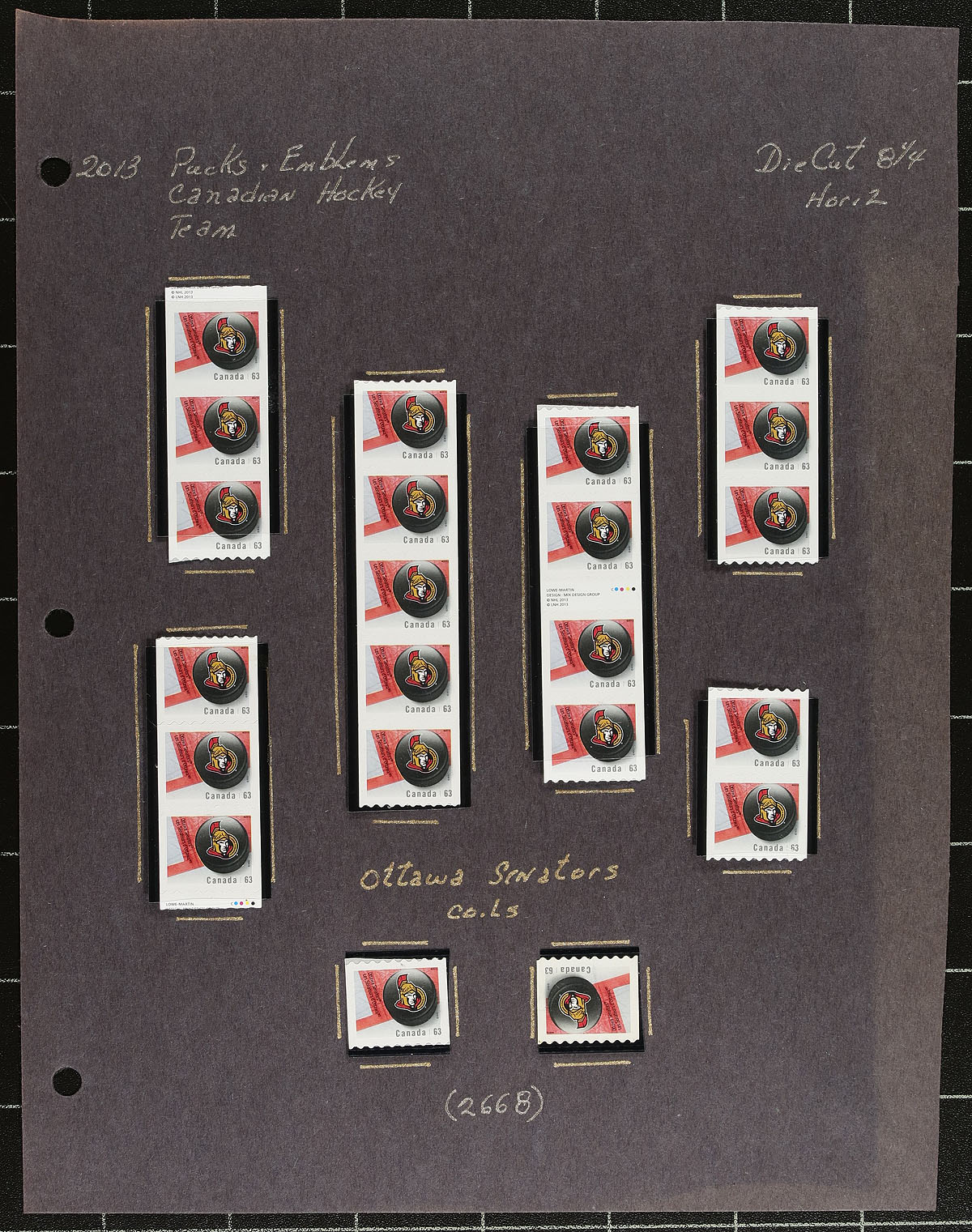 Attractive and seldom seen collection of primarily mint never hinged "NHL Team Logos", September 2013, covering Unitrade #s 2661-2668, all in hingelss mounts on 11 well described pages. The lot contains almost exclusively coil singles, pairs, and strips of 4 for each issue, along with a mint and used souvenir sheet. Face value alone totals $114. A great lot for Canada and topical collectors. Undervalued in the catalogue! 2024 Unitrade =