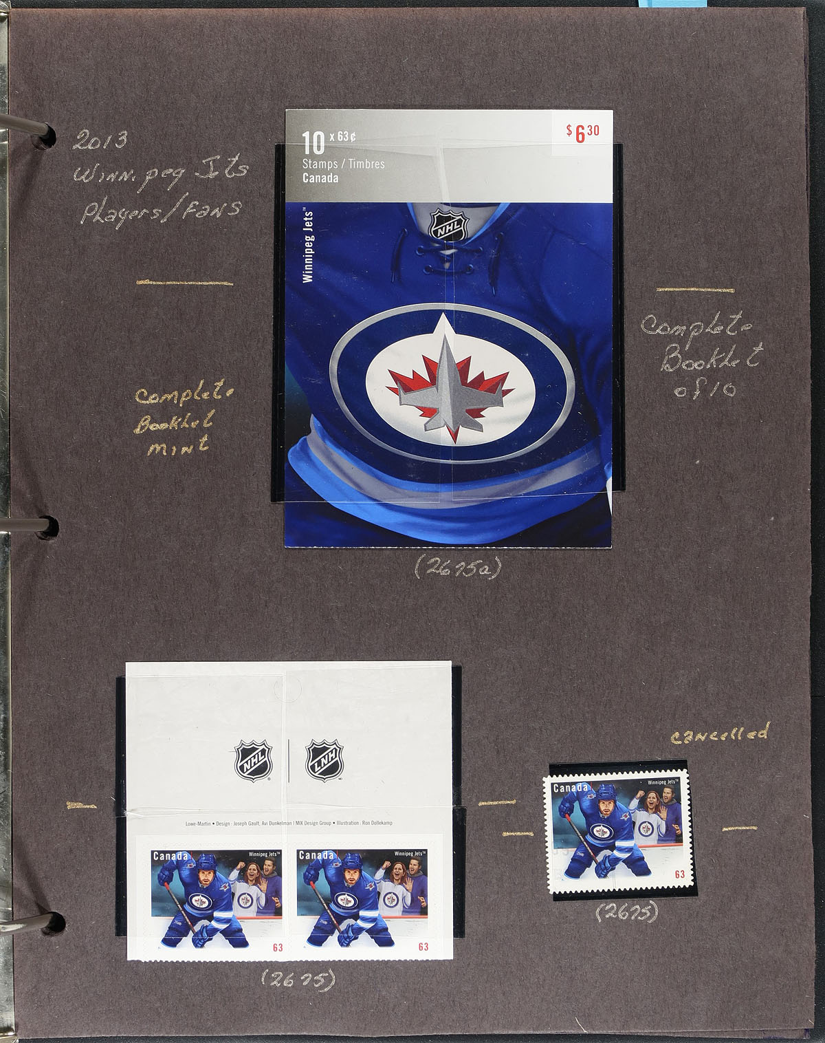 Seldom offered collection of primarily mint never hinged "NHL Team Jerseys", September 2013, covering Unitrade #s 2669-2676, all in hingeless mounts on a over 20 well described pages, housed in a binder. The collection contains primarily complete booklets (2 per issue), mint and used booklet stamps (singles and pairs), and a few souvenir sheets and first day covers. Face value alone totals $149.00. A terrific lot for Canada and topical collectors. Undervalued in the catalogue. 2024 Unitrade =