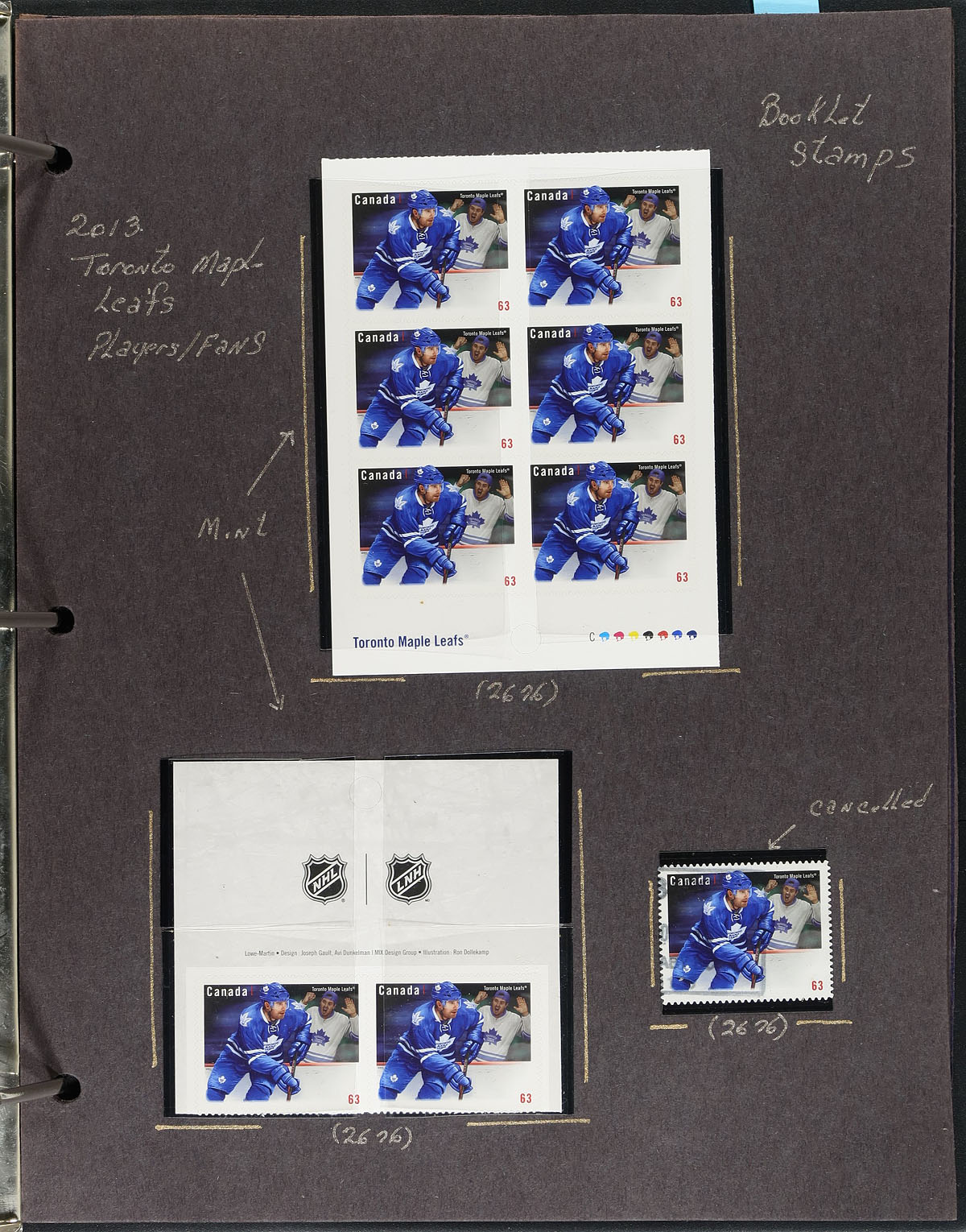 Seldom offered collection of primarily mint never hinged "NHL Team Jerseys", September 2013, covering Unitrade #s 2669-2676, all in hingeless mounts on a over 20 well described pages, housed in a binder. The collection contains primarily complete booklets (2 per issue), mint and used booklet stamps (singles and pairs), and a few souvenir sheets and first day covers. Face value alone totals $149.00. A terrific lot for Canada and topical collectors. Undervalued in the catalogue. 2024 Unitrade =
