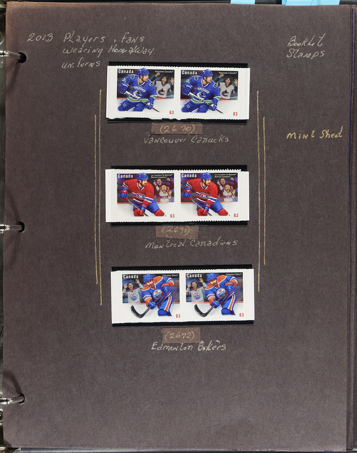 Seldom offered collection of primarily mint never hinged "NHL Team Jerseys", September 2013, covering Unitrade #s 2669-2676, all in hingeless mounts on a over 20 well described pages, housed in a binder. The collection contains primarily complete booklets (2 per issue), mint and used booklet stamps (singles and pairs), and a few souvenir sheets and first day covers. Face value alone totals $149.00. A terrific lot for Canada and topical collectors. Undervalued in the catalogue. 2024 Unitrade =