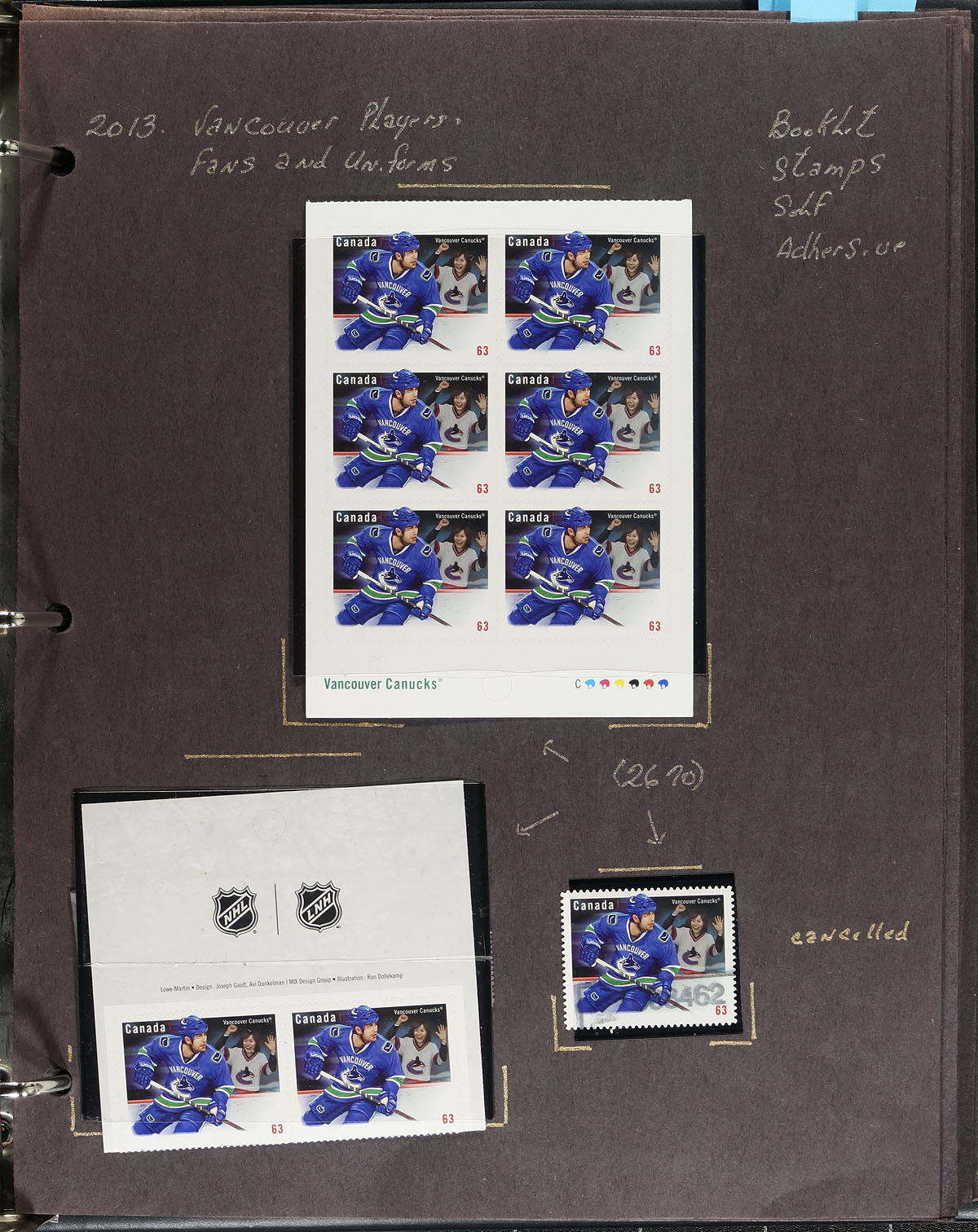 Seldom offered collection of primarily mint never hinged "NHL Team Jerseys", September 2013, covering Unitrade #s 2669-2676, all in hingeless mounts on a over 20 well described pages, housed in a binder. The collection contains primarily complete booklets (2 per issue), mint and used booklet stamps (singles and pairs), and a few souvenir sheets and first day covers. Face value alone totals $149.00. A terrific lot for Canada and topical collectors. Undervalued in the catalogue. 2024 Unitrade =