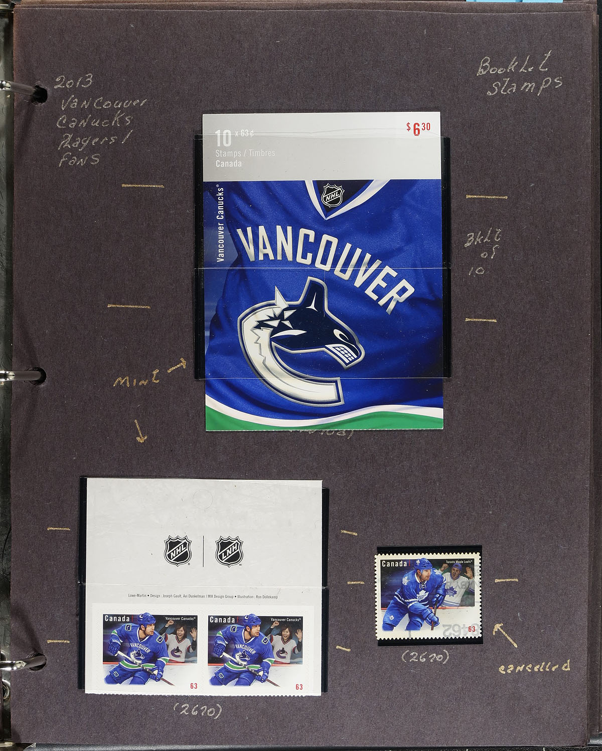 Seldom offered collection of primarily mint never hinged "NHL Team Jerseys", September 2013, covering Unitrade #s 2669-2676, all in hingeless mounts on a over 20 well described pages, housed in a binder. The collection contains primarily complete booklets (2 per issue), mint and used booklet stamps (singles and pairs), and a few souvenir sheets and first day covers. Face value alone totals $149.00. A terrific lot for Canada and topical collectors. Undervalued in the catalogue. 2024 Unitrade =