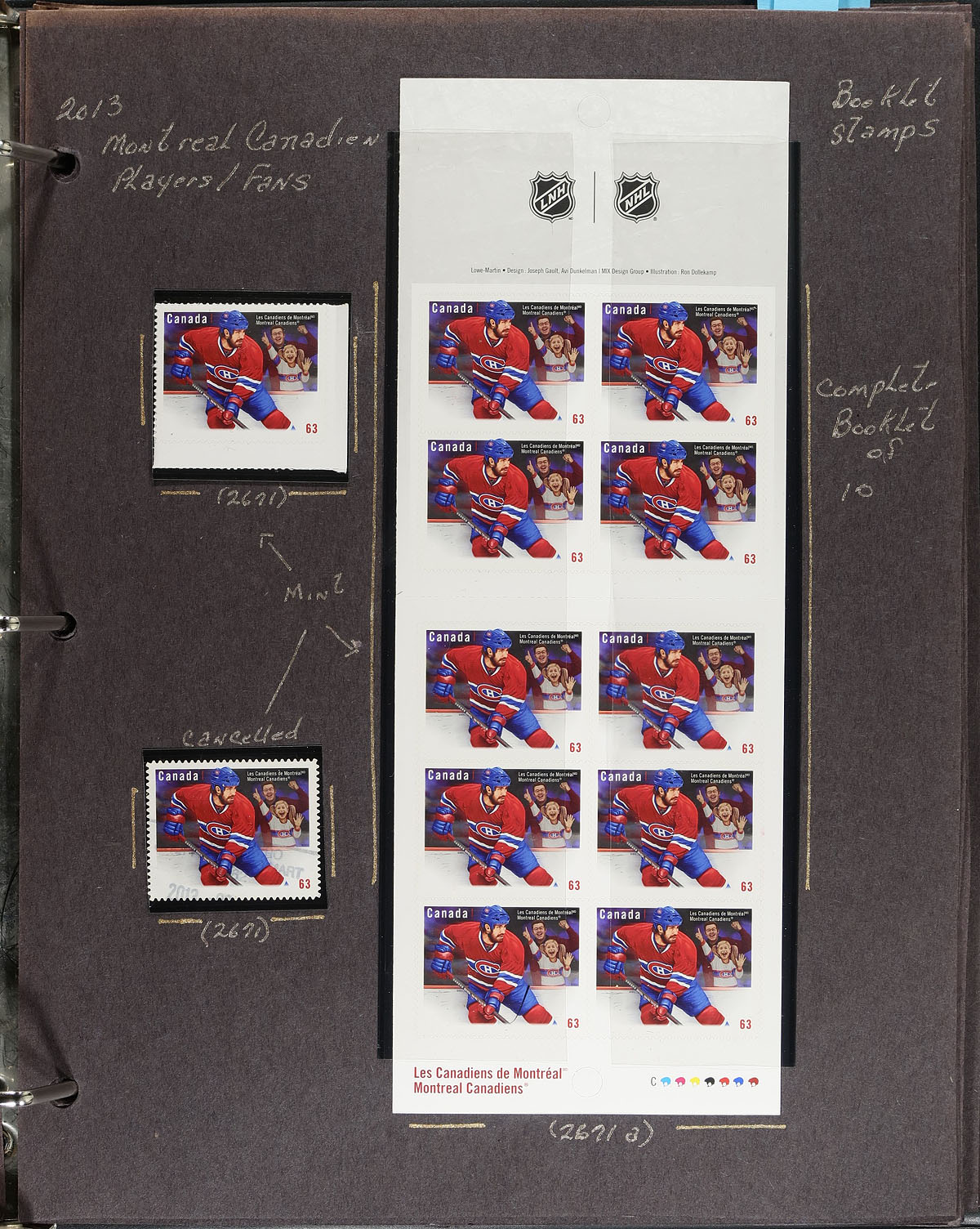 Seldom offered collection of primarily mint never hinged "NHL Team Jerseys", September 2013, covering Unitrade #s 2669-2676, all in hingeless mounts on a over 20 well described pages, housed in a binder. The collection contains primarily complete booklets (2 per issue), mint and used booklet stamps (singles and pairs), and a few souvenir sheets and first day covers. Face value alone totals $149.00. A terrific lot for Canada and topical collectors. Undervalued in the catalogue. 2024 Unitrade =