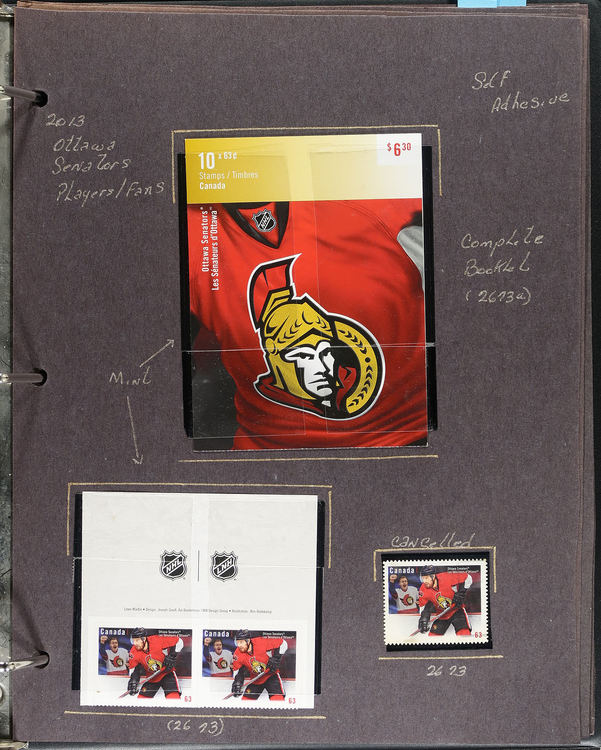 Seldom offered collection of primarily mint never hinged "NHL Team Jerseys", September 2013, covering Unitrade #s 2669-2676, all in hingeless mounts on a over 20 well described pages, housed in a binder. The collection contains primarily complete booklets (2 per issue), mint and used booklet stamps (singles and pairs), and a few souvenir sheets and first day covers. Face value alone totals $149.00. A terrific lot for Canada and topical collectors. Undervalued in the catalogue. 2024 Unitrade =