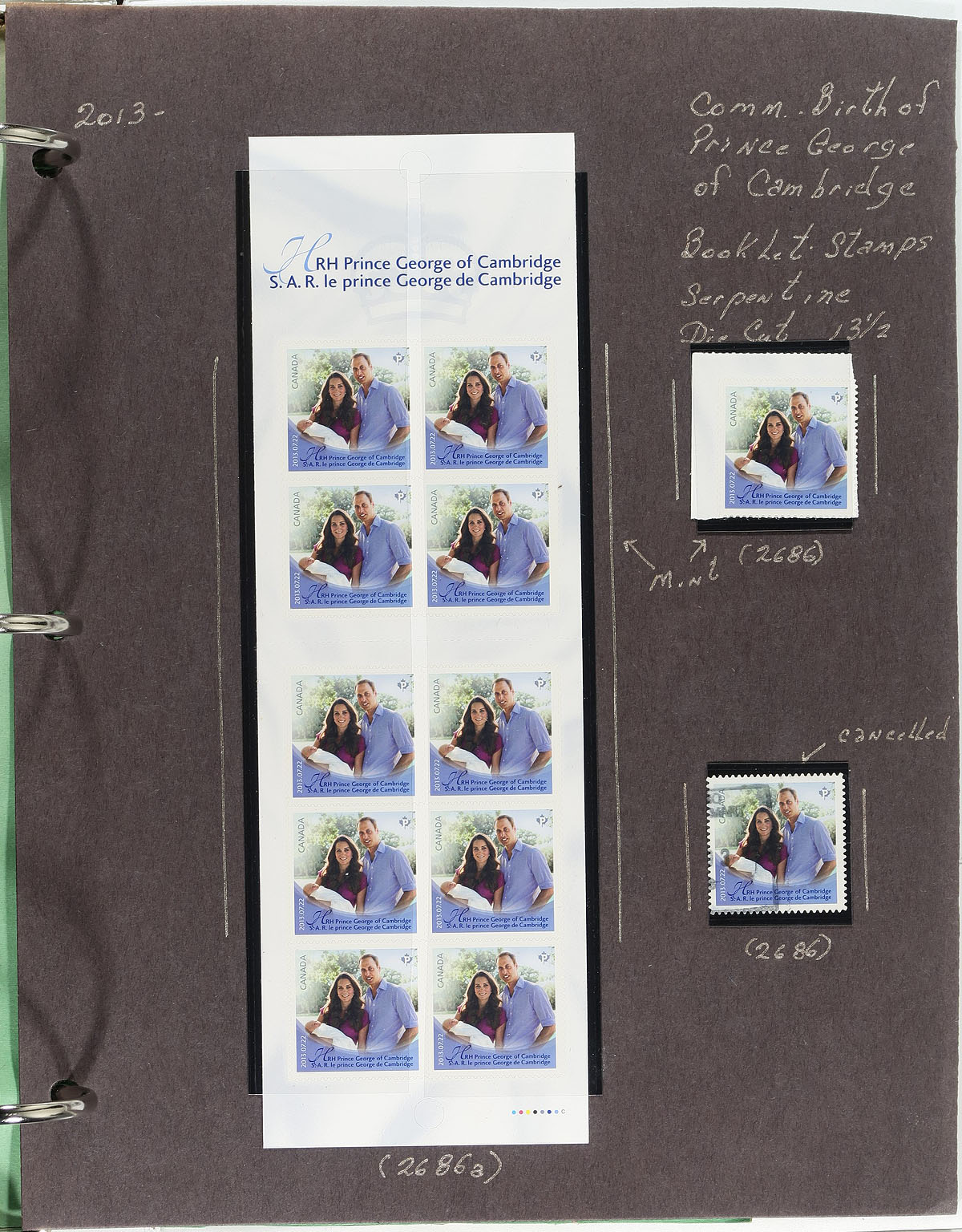 Lovely collection of primarily mint never hinged Canada, from September to October 2013, covering Unitrade #s 2677-2686, all in hingeless mounts in over 20 well described pages. The collection contains mostly booklets and part panes, along with mint and used souvenir sheet, coil singles, and a few first day covers. We note several items cataloguing $10.00 and up. Face value alone totals $185.00. A terrific lot for all collectors. 2024 Unitrade =