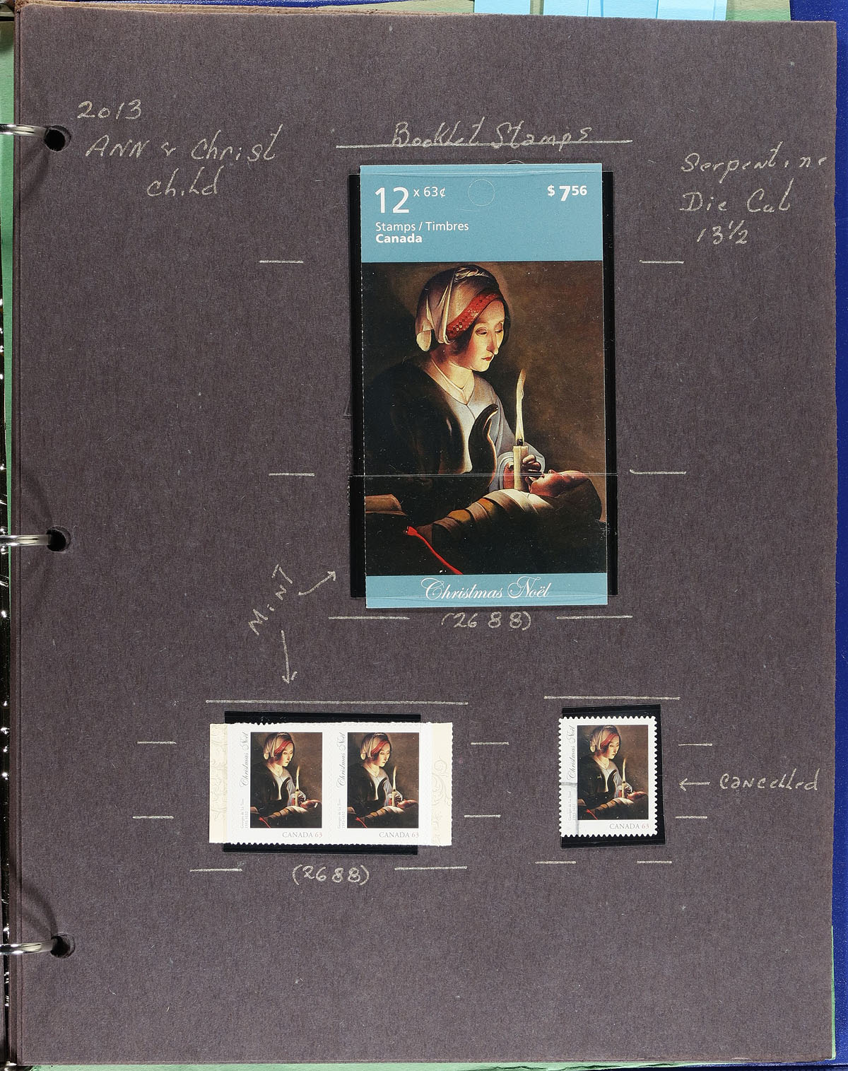 Lovely collection of primarily mint never hinged "Christmas" issues, October 2013, covering Unitrade #s 2687-2691, all in hingless mounts in 15 well described pages. The collection contains primarily complete booklets, and mint and used booklet stamps, along with a few souvenir sheets and first day covers. Face value alone totals $130.00. A lovely collection for Christmas and Canada collectors. 2024 Unitrade =